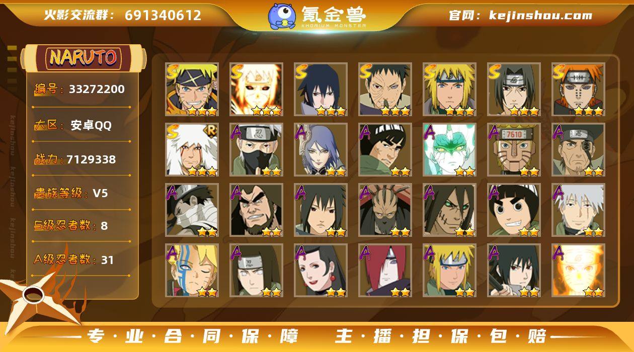 8S忍/31A忍/战力712W/V5/区服3664 【S忍者】 宇智波佐助「漩涡鸣人」,宇智波佐助「永恒万花筒」,宇智波带土「忍界大战」,自来也「舞之豪杰」,宇智波鼬「须佐能乎」,佩恩「天道」,波风水门,波风水门「九喇嘛连结」, 【A忍者】 小南「神驹佑将」,旗木卡卡西「神威对决」,机械鸣人「初始形态」,巳月「仙人模式」,迈特凯「青春爆炸」,土台「忍界大战」,不缘,日向宁次「忍界大战」,漩涡博人「桃式显现」,旗木卡卡西「幻之真容」,李洛克「忍界大战」,蝎「绯流琥」,宇智波泉奈,神农「羁绊」,桃地再不斩「秽土转生」,角都「秽土转生」,长门「青年」,波风水门「青年」,宇智波佐助「须佐能乎」,漩涡鸣人「九尾查克拉」,宇智波佐助「万花筒写轮眼」,飞段「死司凭血」,飞段,迪达拉,我爱罗「疾风传」,蝎,干柿鬼鲛,宇智波鼬,猿飞阿斯玛,迈特凯,桃地再不斩, PX_2556554
