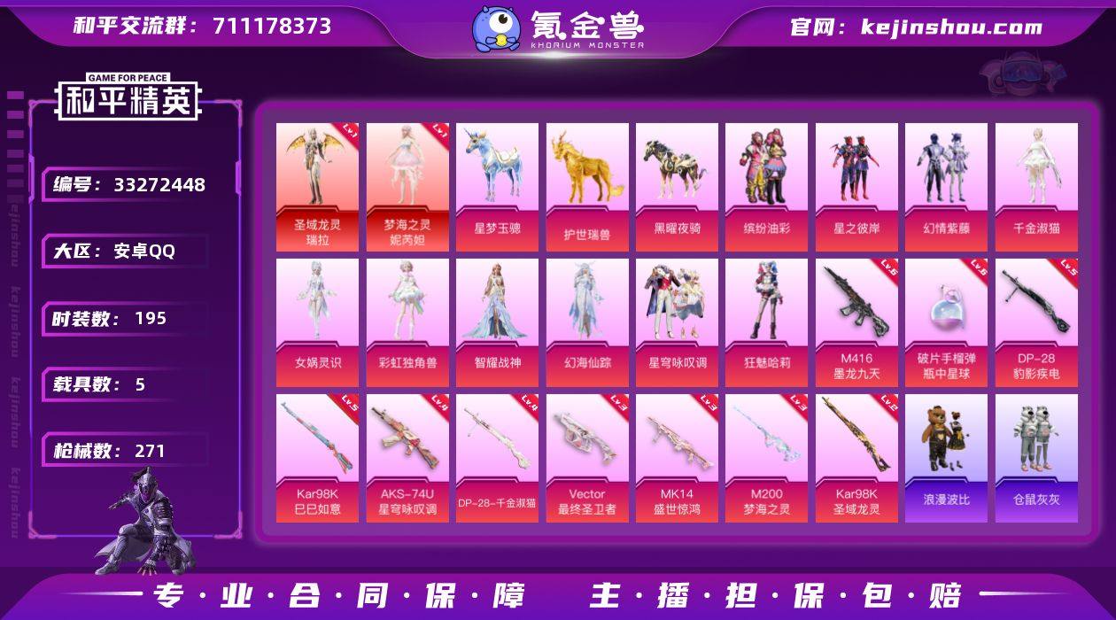 安卓 手Q-3神装-10粉装-12特效枪-5载具-13粉色飞行器-102664热力值-10王牌印记-195套装-271枪皮 【红色神装等级】:霜月狼主-尼诺(五级),圣域龙灵-瑞拉(一级),梦海之灵-妮芮妲(一级) 【红色角色神装】:霜月狼主-尼诺,圣域龙灵-瑞拉,梦海之灵-妮芮妲 【热门品类】:粉装-缤纷油彩,套装-SS1特训,套装-龟仙人,套装-浪漫波比,套装-粉红小猪,套装-红熊茄茄 【粉色套装】:粉装-缤纷油彩,粉装-星之彼岸,粉装-幻情紫藤,角色-千金淑猫,角色-女娲灵识,角色-彩虹独角兽,角色-智耀战神,角色-幻海仙踪,粉装-星穹咏叹调,角色-狂魅哈莉 【粉色枪皮等级】:M416-墨龙九天(六级),AUG-花中眠(三级),ACE32-萌骑漫游(三级),Vector-最终圣卫者(三级),AKS-74U-星穹咏叹调(四级),Kar98K-巳巳如意(五级),Kar98K-圣域龙灵(二级),Mk14-盛世惊鸿(三级),M200-梦海之灵(三级),DP-28-千金淑猫(四级),DP-28-豹影疾电(五级),破片手榴弹-瓶中星球(六级) 【粉色载具】:旅行汪汪(海风蓝),星梦玉骢,护世瑞兽,黑曜夜骑,凌风神骏 【粉色枪皮】:M416-墨龙九天,AUG-花中眠,ACE32-萌骑漫游,Vector-最终圣卫者,AKS-74U-星穹咏叹调,Kar98K-巳巳如意,Kar98K-圣域龙灵,Mk14-...