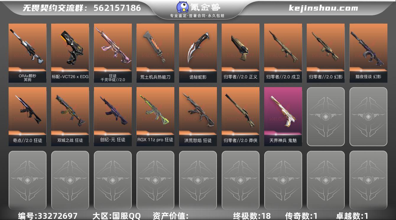 【套装】:归零者//2.0套装 【英雄】:幻棱,炼狱,维斯,暮蝶,钛狐,壹决,捷风,不死鸟,贤者,猎枭,蝰蛇,芮娜,尚勃勒,霓虹,夜露 【近战武器】:近战武器-碎心裂刃,近战武器-影钩,近战武器-荒土机兵 热能刀,近战武器-生物分子解离器,近战武器-诡秘蛇影 军刀 【狂徒】:狂徒-洪荒怒焰,狂徒-奇点//2.0,狂徒-双城之战,狂徒-创·纪元,狂徒-RGX 11z Pro,狂徒-千灵华绽//2.0,狂徒-荒土机兵,狂徒-诡秘蛇影 【幻影】:幻影-黯夜怪谈,幻影-归零者//2.0,幻影-纳米打击,幻影-末日之翼 【戍卫】:戍卫-归零者//2.0,戍卫-逆冲蛮牛,戍卫-折光棱晶 【獠犬】:獠犬-逆冲蛮牛 【冥驹】:冥驹-ORA x 颗秒,冥驹-荒土机兵 【飞将】:飞将-末日之翼 【莽侠】:莽侠-归零者//2.0,莽侠-诡秘蛇影 【奥丁】:奥丁-纳米打击,奥丁-末日之翼 【判官】:判官-诡秘蛇影,判官-纳米打击x 【雄鹿】:雄鹿-逆冲蛮牛 【骇灵】:骇灵-荒土机兵 【蜂刺】:蜂刺-折光棱晶 【标配】:标配-荒土机兵,标配-折光棱晶 【VCT手枪】:标配-VCT26 x EDG 【正义】:正义-归零者//2.0,正义-纳米打击 【鬼魅】:鬼魅-天界神兵,鬼魅-诡秘蛇影,鬼魅-星云暗涌 【狂怒】:狂怒-逆冲蛮牛 【短炮】:短...