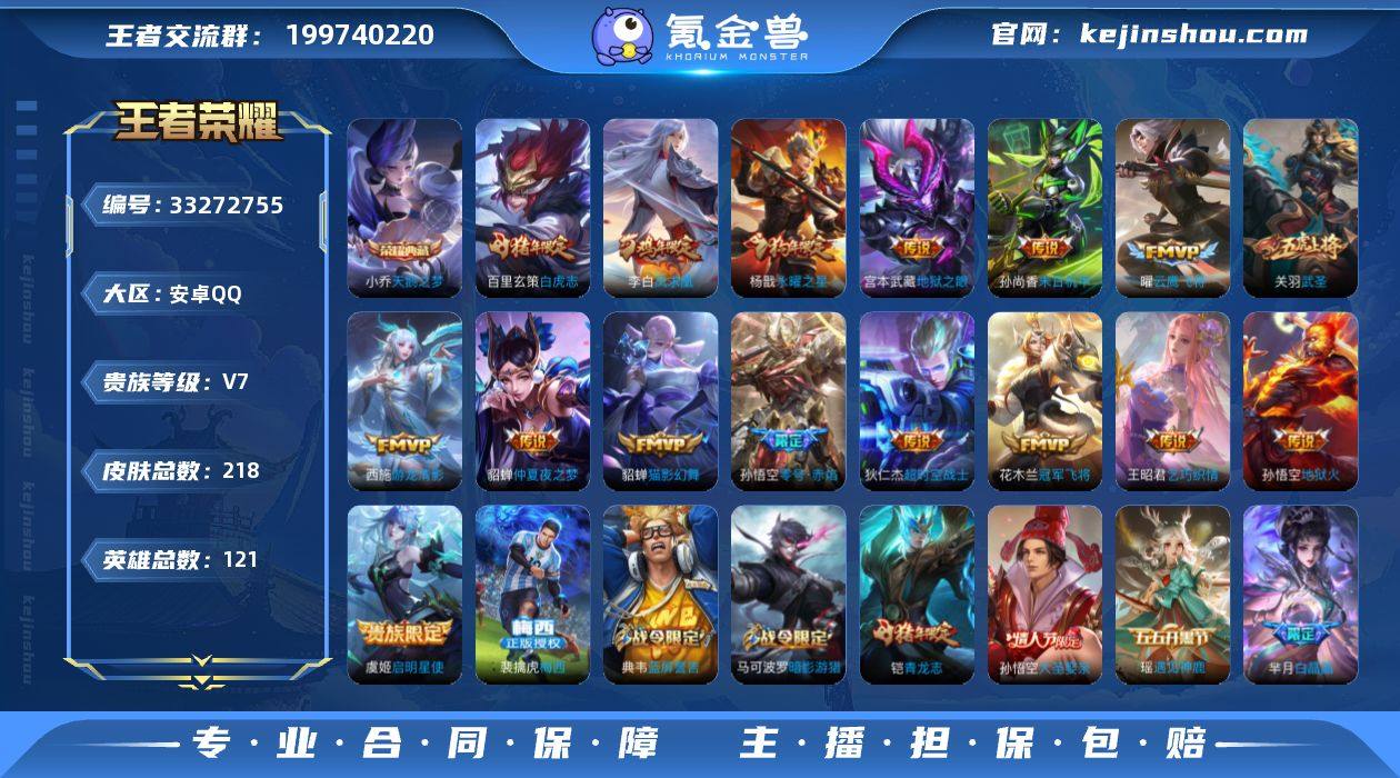 实名: 可修改 性别: 女号 贵族等级: V7 英雄数: 121 皮肤数: 218 荣耀水晶: 天鹅之梦 传说皮: 冠军飞将,云鹰飞将,猫影幻舞,末日机甲-孙尚香,地狱火,仲夏夜之梦,零号·赤焰,地狱之眼,乞巧织情,游龙清影,超时空战士-狄仁杰 限定皮: 遇见飞天,李小龙,梁祝,武圣,白晶晶,虎魄,永曜之星,飞衡,天狼征服者,凤求凰,美猴王,白虎志,青龙志,梅西,一生所爱,如梦令-后羿,大圣娶亲,五谷丰年