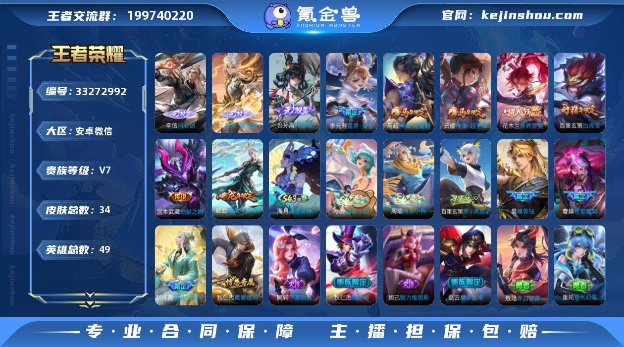 【aswz1786】安卓WX-V7-最强王者段位-44英雄-32皮肤-3无双-7传说-9史诗 【英雄全皮】:孙权全皮,敖隐全皮 【无双皮肤】:李信问心剑,曜器灵螭龙剑,公孙离离恨烟 【传说皮肤】:云缨神骥越千峰,马超神骥逐星野,李元芳星君娄金,花木兰异界灵契,赵云乘龙铭钟鼎,百里玄策白虎志,宫本武藏地狱之眼 【限定皮肤】:公孙离离恨烟,暃埋骨钱,狄仁杰阴阳师,赵云皇家上将,狄仁杰魔术师,项羽海滩派对,百里玄策白虎志,赵云乘龙铭钟鼎,曹操夜都魔契 【年限皮肤】:百里玄策白虎志,赵云乘龙铭钟鼎 【战令限定】:周瑜线条小狗,小乔线条小狗 【史诗皮肤】:周瑜线条小狗,小乔线条小狗,百里玄策罗小黑战记,赵怀真器灵浮梦炉,暃埋骨钱,曹操夜都魔契,阿轲节奏热浪,妲己魅力维加斯,狄仁杰魔术师,赵云皇家上将 【其他皮肤】:蚩奼极光幻客,孙权径山谋武,王昭君幻想奇妙夜,狄仁杰阴阳师,赵云忍炎影,韩信街头霸王,项羽海滩派对,盘古创世神祝,盾山极冰防御线,百里玄策威尼斯狂欢,铠龙域领主 【营地ID】:1550986265