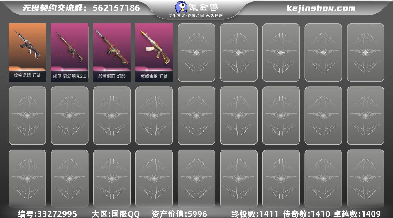 【英雄】:幻棱,炼狱,钛狐,壹决,铁臂,捷风,幽影,不死鸟,贤者,猎枭,芮娜,K/O,钢锁 【近战武器】:近战武器-神圣领域 战刀 【狂徒】:狂徒-虚空遗器,狂徒-紫阙金琅 【幻影】:幻影-般若假面,幻影-神圣领域 【戍卫】:戍卫-奇幻朋克//2.0,戍卫-月球哨兵 【獠犬】:獠犬-神圣领域 【冥驹】:冥驹-星云暗涌 【莽侠】:莽侠-月球哨兵 【战神】:战神-神圣领域 【雄鹿】:雄鹿-月球哨兵 【骇灵】:骇灵-星云暗涌 【蜂刺】:蜂刺-星云暗涌 【标配】:标配-海洋之星//2.0 【正义】:正义-西部未来,正义-月球哨兵 【鬼魅】:鬼魅-星云暗涌 【狂怒】:狂怒-神圣领域 【卡面】:树懒大作战 卡面,无垠星环 卡面,《双城之战》金克丝 卡面,代号红色 卡面,新兵报到 卡面,V契约 卡面,无畏契约 卡面 【喷漆】:放下武器 喷漆,胜利属于无畏契约 喷漆,GLHF 喷漆,无畏契约 喷漆 【挂饰】:动力机箱 挂饰,无畏契约 纪念币 挂饰