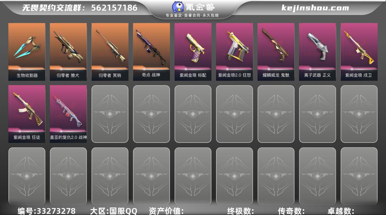 [18551003]10橙皮 10紫皮 63皮肤 24英雄 69卡面 650已用源晶 未定级段位 【套装】归零者套装 【近战武器皮肤】诡秘蛇影,日耀风暴 遗器,爪刀-RGX 11z Pro 3.0,军刀-弧光异彩,生物收割器 【佩枪皮肤】正义-离子武器,鬼魅-耀鳞威龙,狂怒-紫阙金琅2.0,标配-紫阙金琅,短炮-归零者 【步枪皮肤】狂徒-紫阙金琅,狂徒-盖亚的复仇,狂徒-归零者,幻影-侦察力量,幻影-紫阙金琅2.0,戍卫-紫阙金琅,獠犬-归零者 【狙击枪皮肤】冥驹-归零者 【机枪皮肤】战神-奇点,战神-盖亚的复仇2.0 【挂饰】归零者挂饰,针织蜜蜂挂饰,冬日絮语挂饰,魄月玄兔挂饰,幸运中国结挂饰,神中神挂饰