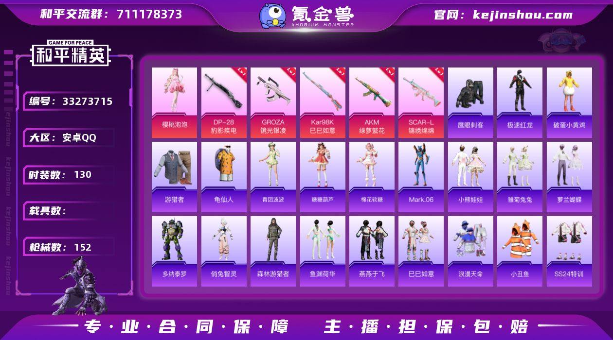 安卓 手Q-1粉装-8特效枪-0载具-0粉色飞行器-42909热力值-13王牌印记-130套装-152枪皮 【热门品类】:套装-浪漫天命,套装-小丑鱼,套装-AG战队服,套装-龟仙人,角色-Mark.06 【粉色套装】:角色-樱桃泡泡 【粉色枪皮等级】:AKM-绿萝繁花(五级),SCAR-L-锦绣绵绵(五级),GROZA-镜光银凌(五级),UMP45-萌骑冒险(五级),AKS-74U-森灵之息(五级),Kar98K-巳巳如意(五级),Mk14-福马献瑞(五级),DP-28-豹影疾电(五级) 【粉色枪皮】:AKM-绿萝繁花,SCAR-L-锦绣绵绵,GROZA-镜光银凌,UMP45-萌骑冒险,AKS-74U-森灵之息,Kar98K-巳巳如意,Mk14-福马献瑞,DP-28-豹影疾电 【粉色降落伞】:星之彼岸降落伞,未来歌姬降落伞,闲梦青缨降落伞,圣堂之誓降落伞,忍者神龟降落伞,千金淑猫降落伞,幻影飞狐降落伞,炫彩糖果降落伞 【稀有套装】:套装-龟仙人,套装-巳巳如意,套装-马上来财,套装-迅捷龙虾,套装-雏菊兔兔,套装-萝兰蝴蝶,套装-小熊娃娃,角色-多纳泰罗,套装-糖糖葫芦,套装-青团波波,套装-棉花软糖,角色-俏兔智灵,套装-燕燕于飞,套装-鱼渊荷华,套装-蜜露汐语,套装-雨过天青,套装-红釉青花 【稀有枪皮】:AKM-影袭,AKM-霓虹街区,AKM-龙的传人,SCAR-L-夜灯...