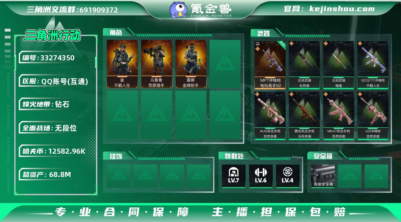 【乐乐L475】【行动等级60】【资产68.8M】【现金12582k】【仓库7】【指挥中心4】【训练中心6】【靶场4】【潜水中心1】【收藏室1】【不羁人生】【荒原猎手】【不破誓约】【金牌射手】【暗星】【AW子弹16发】【MP7冲锋枪-电玩高手S2优品c】【安全箱-高级安全箱】