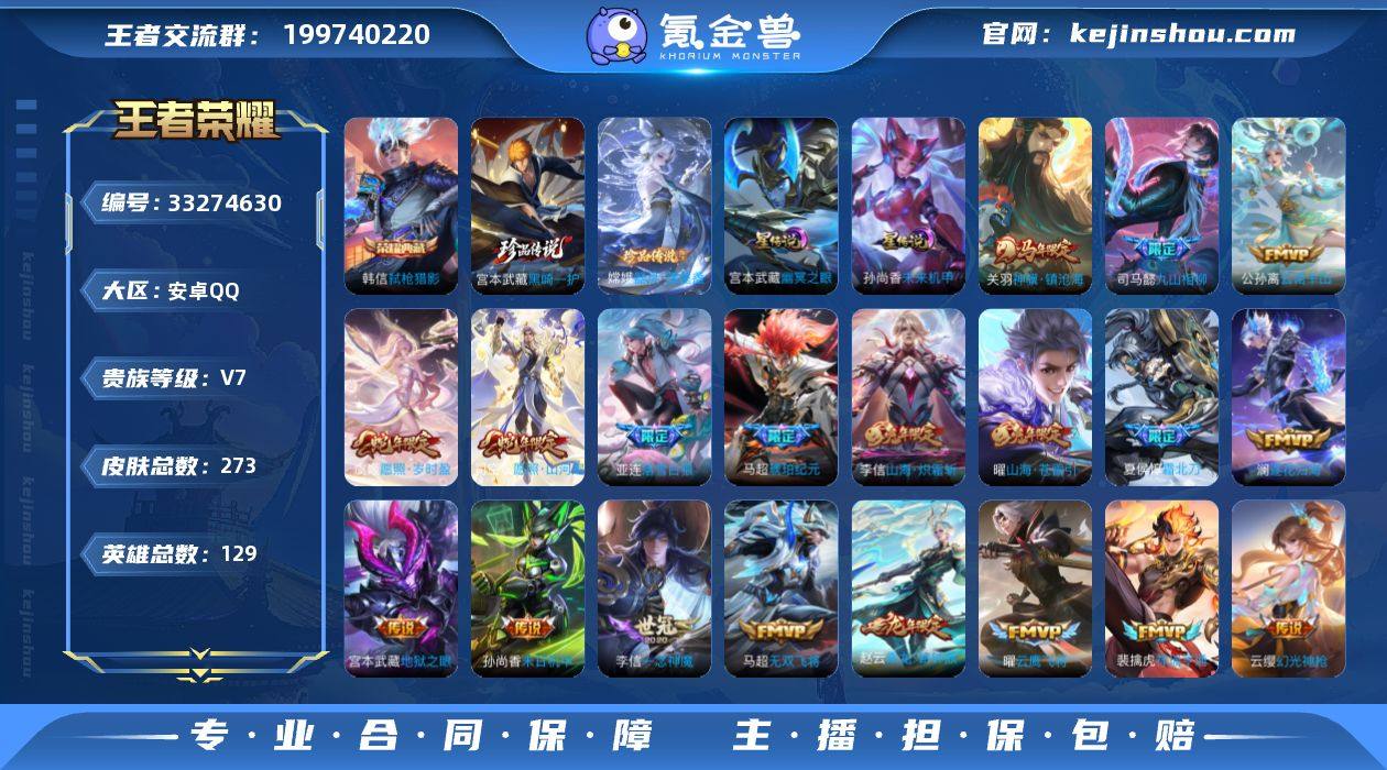 【991】V7-129英雄-273皮肤-1典藏皮肤-2珍品传说-27传说-84史诗,积分夺宝263 cc8546 【英雄全皮】:司马懿全皮,孙权全皮,刘备全皮,敖隐全皮,蒙恬全皮,司空震全皮,空空儿全皮,影全皮 【荣耀典藏】:韩信弑枪猎影 【珍品传说】:宫本武藏黑崎一护,嫦娥器灵落星盏 【传说皮肤】:关羽神骥镇沧海,司马懿九山相柳,公孙离云诺千山,司空震愿照山河定,虞姬愿照岁时盈,云缨幻光神枪,裴擒虎祥瑞亨通,桑启鸣野蒿,夏侯惇霜北刀,亚连落雪白狼,赵云乘龙铭钟鼎,马超琥珀纪元,澜逐花归海,宫本武藏惊梅引,马可波罗妄想实况,曜山海苍雷引,李信山海炽霜斩,马超无双飞将,曜云鹰飞将,李信一念神魔,刘备时之恋人,张良黄金白羊座,干将莫邪久胜战神,梦奇胖达荣荣,孙尚香末日机甲,宫本武藏地狱之眼,孙悟空地狱火 【限定皮肤】:夏侯惇霜北刀,蒙犽顽岩魄,大乔绒语心约,姜子牙天穹之誓,杨戬破阵退雄兵,狄仁杰阴阳师,赵云皇家上将,赵云龙胆,扁鹊奇幻香踪,芈月幻夜卜梦,元歌云间偶戏,元歌无心,马可波罗暗影游猎,马可波罗妄想实况,狄仁杰魔术师,达摩沙漠行僧,项羽海滩派对,关羽百相守梦,韩信傲雪梅枪,刘备百相守梦,李元芳云中旅人,百里玄策原初追逐...