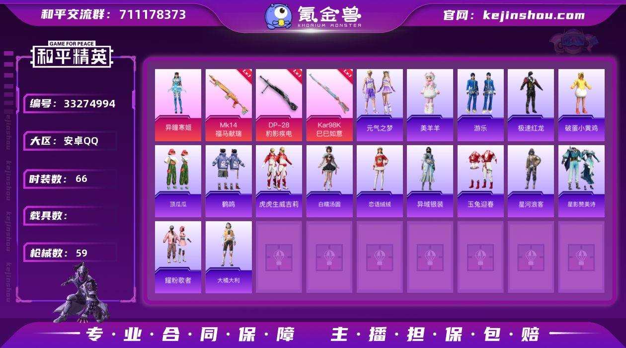 M1047579【1粉装-3特效枪】安卓手Q-1粉装-3特效枪-66套装-59枪皮-3王牌印记-英勇黄金Ⅰ-17155热力值【1粉装】角色-异瞳寒姬【3特效枪】Kar98K-巳巳如意[5级],Mk14-福马献瑞[5级],DP-28-豹影疾电[5级]【6飞行器】马上有福飞行器,破刃行动尾迹,异域银装飞行器,鸡智如我飞行器,极意拳锋飞行器,炫彩糖果飞行器【121其它衣服和枪皮】黑色伏地魔,都市魅力,游乐,海岛探路者,极速红龙,滨海厨神,黄色运动,青涩时光,福星高照,战地督导,魅力单车,橘黑制服,角色-瑰石海星,白熊同盟,玉兔迎春,SS33特训,SS35特训,鹤鸣,街头潮人,缤纷果语,老实芭蕉,破晓战魂,王牌教练,灼焰舞者,超能元气,特训学院,恋语绒绒,漫游都市,SS32特训,猎鹰,萌鸡速递,幻影武者,星河浪客,格斗先锋,白糯汤圆,SS37特训,星影赞美诗,马上来财,青年教官,香桃花海,虎虎生威吉莉,蓝彩潮人,云魄琉璃,耀粉歌者,黄色名流,大橘大利,玩偶服-美羊羊,竞技达人朋克,炫彩糖果,猛禽,冷焰舞者,元气之梦,SS36特训,完美偶像,柠萌假日,薄荷星砂,绮丽涂鸦,破蛋小黄鸡,SS31特训,玲珑侠影,异域银装,深蓝色名流,SS34特训,元素星魂,顶瓜瓜,DP-28-彩虹符号,S12K-夜灯,SCAR-L-暗夜玫瑰,GROZA-福马献瑞,Vector-生命誓言,十字弩-异瞳寒姬,AC-VAL-天降萌...