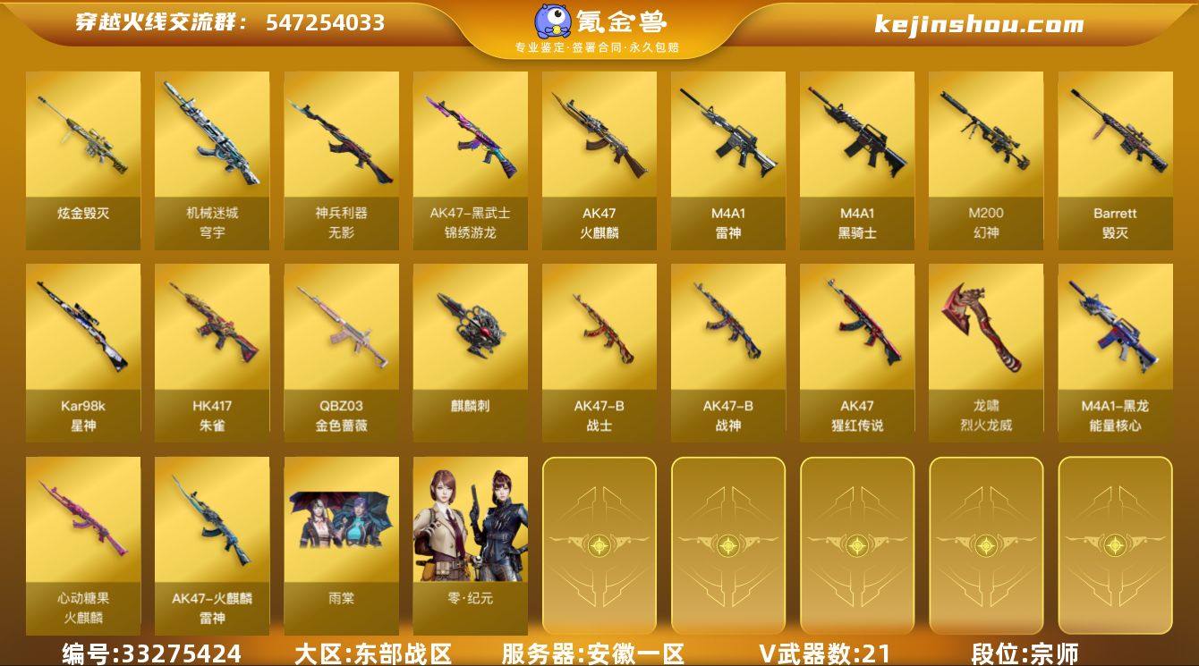 【ky6881】安徽一区-22V-0王者武器数-1炫金武器数 【热门武器】:QBZ03-金色蔷薇,HK417-朱雀,M200-幻神,死亡之眼,Kar98K-星神,M4A1-黑骑士 【王者炫金武器】:炫金毁灭 【音效卡】:M4A1-黑骑士音效卡,Barrett-极光音效卡,Barrett-碧霄极光音效卡 【皮肤】:火麒麟-雷神*2,火麒麟-心动糖果,黑龙-能量核心,黑骑士-破界 皮肤 【角色】:雨棠,零·纪元,修道士,暗夜-X,电竞少女,飞虎队-X,风暴女*2,嘉年华灵狐,0号玩家,灵狐者-X,麻雀,曼陀罗-X,潘多拉-X,潜龙队-X,青霞仙子,斯沃特-X,蜀雪,维纳斯,雪莉杨,雪莉杨-摸金校尉,影武者-X,游珑儿 【人偶武器】:AWM-灵狐-15周年嘉年华,迷你波特博士*2,迷你火种,闪光弹-小乔 【暴走生化】:死亡之眼,超级对讲机 【挑战大师】:激光毁灭者III-白马银枪,神圣爆裂者-末日III 【英雄级武器】:AK47-火麒麟,M4A1-雷神,M4A1-黑骑士,HK417-朱雀,QBZ03-金色蔷薇,无影-神兵利器,黑武士-锦绣游龙,AK-47-猩红传说,AK47-B-战神,机械迷城-穹宇,AK47-B-战士,Barrett-毁灭,M200-幻神,Kar98K-星神,麒麟刺,尼泊尔-雷霆,龙啸-烈火龙威,高爆手雷-雷霆,闪光弹-雷霆,烟雾弹-雷霆,烟雾弹-竞技荣光 【其他武...