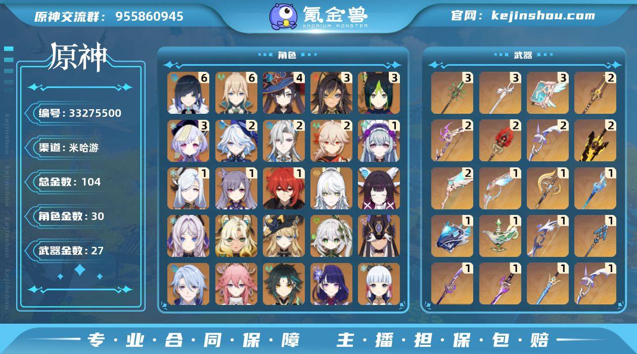 邮箱: 不送邮/死邮 总黄数: 104 冒险等级: 60 6命金色角色: 满命琴,满命夜兰 4命金色角色: 四命莫娜 3命金色角色: 三命七七,三命提纳里,三命迪希雅 2命金色角色: 二命枫原万叶,二命那维莱特,二命芙宁娜 1命金色角色: 一命迪卢克,一命刻晴,一命申鹤,一命梦见月瑞希 0命金色角色: 优菈,神里绫华,达达利亚,钟离,甘雨,魈,胡桃,雷电将军,八重神子,神里绫人,赛诺,纳西妲,娜维娅,希诺宁,茜特菈莉,哥伦比娅,兹白 拥有武器: 狼的末路,天空之翼,雾切之回光,飞雷之弦振,天空之卷,和璞鸢,阿莫斯之弓,天空之傲,风鹰剑,天空之刃,无工之剑,磐岩结绿,护摩之杖,薙草之稻光,苍古自由之誓,终末嗟叹之诗,冬极白星,息灾,若水,赤沙之杖,千夜浮梦,万世流涌大典,静水流涌之辉,裁断,白雨心弦 3精武器: 天空之卷,和璞鸢,风鹰剑 2精武器: 天空之翼,飞雷之弦振,阿莫斯之弓,无工之剑,护摩之杖,赤沙之杖 1精武器: 狼的末路,雾切之回光,阿莫斯之弓,天空之傲,天空之刃,磐岩结绿,薙草之稻光,苍古自由之誓,终末嗟叹之诗,冬极白星,息灾,若水,千夜浮梦,万世流涌大典,静水流涌之辉,裁断,白雨心弦