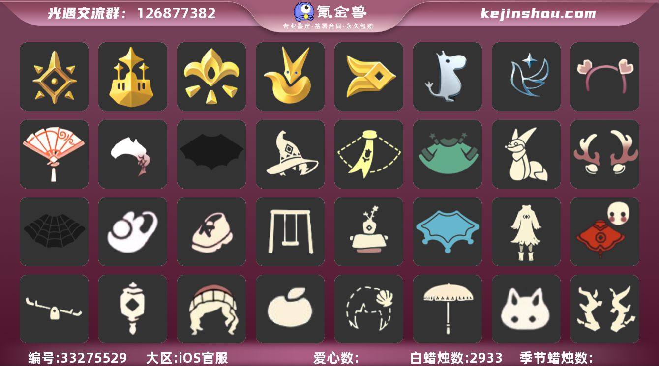 iOS官服 手机账号 2珍稀物品 10毕业季 6毕业图 2933蜡烛 【珍稀物品】阿努比斯(狗头),玫瑰花 【季节已毕业】预言季,梦想季,集结季,小王子季(王子季),风行季,姆明季,青鸟季,双星季,迁徙季,织光季 【完成地图】晨岛,云野,雨林,霞谷,墓土(暮土),禁阁 【礼包】女巫裙,兔子鞋(兔子拖鞋),运动鞋(跃动跑鞋),彩虹帽(多彩绒帽),巫师(巫师帽),蛛网朋克(蜘蛛朋克头),橘子(大橘大利),雪花(雪花发夹),贝壳(贝壳发饰),兔子(玉兔头饰)(玉兔发饰)(兔子发饰),心心相印发饰礼包,四叶草(四叶草头饰),彩虹耳钉(彩虹耳饰),日光耳环,枯角(巫树犄角),鹿角(圣诞鹿角),创始人(创始人斗篷),围巾(小王子斗篷)(小王子围巾),星球斗(星球夹克),福娃(福娃礼包)(春之日礼包)(铜钱斗),蝙蝠套(蝙蝠斗篷)(南瓜头),蜘蛛斗(蛛丝斗篷)(蛛网斗篷),透明蛛丝(透明蜘蛛斗),瑞雪(瑞雪斗篷)(暖冬瑞雪),献瑞折扇礼包,灯笼(中秋灯笼),黄伞(夏日阳伞),秋千(情人秋千),跷跷板(情人跷跷板),茶桌(花憩茶桌),小狐狸(狐狸背包),南瓜(冥龙南瓜) 【裤子】妮妮裙子(妮妮长裙),王子服(小王子套装),武士裤,背带裤,搓澡巾,击剑裤 【面具】贴花面具(丛林黑面具),裂纹面具,阿努比斯,凤凰面具 【面饰】青鸟毕业面饰(青鸟面饰),红耳机 【发型...