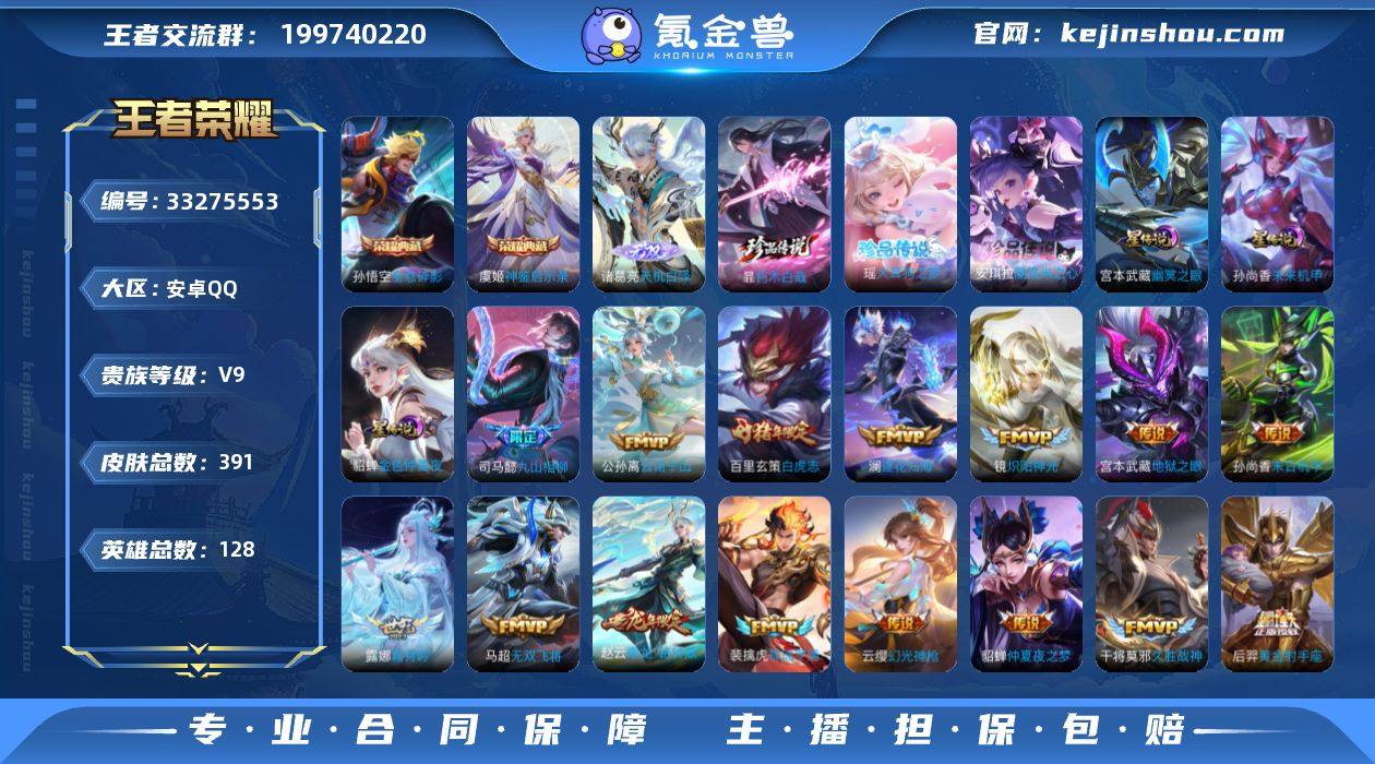 贵族9级,391皮肤,0水晶,3珍品传说,2典藏,1无双,23传说,36星元,117史诗,17个性按键,皮肤价值:294426;【典藏】:虞姬神鉴启示录,孙悟空全息碎影;【无双皮肤】:诸葛亮天机白泽;【珍品传说】:安琪拉酷洛米之心,瑶大耳狗之梦,暃朽木白哉;【传说】:貂蝉仲夏夜之梦,露娜霜月吟,张良黄金白羊座,司马懿九山相柳,镜炽阳神光,虞姬启明星使,干将莫邪久胜战神,后羿黄金射手座,马可波罗妄想实况,马超无双飞将,澜逐花归海,赵云乘龙铭钟鼎,孙悟空零号赤焰,孙悟空地狱火,孙尚香末日机甲,云缨幻光神枪,裴擒虎祥瑞亨通,公孙离云诺千山,刘备时之恋人,王昭君乞巧织情,百里玄策白虎志,宫本武藏地狱之眼,周瑜音你心动;【星元】:孙尚香未来机甲,宫本武藏幽冥之眼,貂蝉金色仲夏夜,妲己美乐蒂之语,貂蝉荧星流火,兰陵王幽夜猎兽者,小乔HelloKitty,铠曙光捍御者,妲己樱桃雪顶,鲁班七号格斗小子,李元芳九夏金橙,百里玄策元气满满鸭,貂蝉流云霜糖,李白上阳台帖,孙尚香魔法恋语,公孙离觅星灵兔,王昭君暗香疏影,典韦时尚职员,孙策可可蛋糕,诸葛亮潮流达人,小乔热情夏威夷,等等