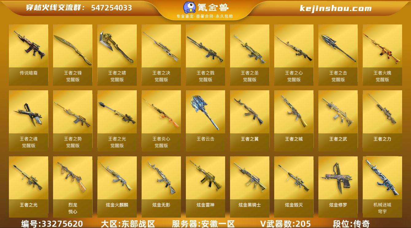 【ky6879】安徽一区-233V-29王者武器数-8炫金武器数 【传说武器】:传说暗裔 【热门武器】:传说暗裔,QBZ03-金色蔷薇*2,Scar Light-白虎*2,HK417-朱雀,M200-幻神,金色蔷薇-古蛇迷踪,修罗-古蛇迷踪,M200-竞技荣光,死亡之眼,Kar98K-星神,C.A.T,M4A1-黑骑士,汤姆逊-烈龙*6,RPK-盘龙,加特林-炼狱*5,斯泰尔-蝴蝶,羊驼玩偶,降世魔童,雷神-小红,裁决-雪莉杨,火麒麟-绝迹,USP-雷暴*2,COP 357-幻灵*2,沙鹰-修罗*3,金刚伞,COP 357-极地霜雄 【王者炫金武器】:王者之城,王者之翼,王者之武,王者之光,王者之力*2,烈龙-悦心,王者云击,王者冰锋,王者之魄高爆手雷,王者之魄闪光弹,炫金火麒麟,炫金骑士,炫金无影,炫金雷神,炫金毁灭,炫金修罗*3 【音效卡】:屠龙-电竞之星-竞星跃动音效卡,M200-幻神音效卡,AK47-火麒麟音效卡*2,M4A1-雷神音效卡*2,M4A1-黑骑士音效卡,Barrett-毁灭音效卡,Barrett-极光音效卡,AWM-裁决音效卡,HK417-朱雀-电竞之星-竞星跃动音效卡,Barrett-碧霄极光音效卡*2,麒麟刺-百战金芒-盛典舞曲音效卡,炼狱-百战金芒-庆典舞曲音效卡,死神-雪域霜狐-怀旧音效卡,70KG语音包 【皮肤】:M200-幻神-N9-2022MVP,幻神-动感闪...