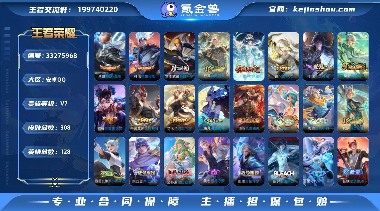 实名: 可修改 贵族等级: V7 英雄数: 128 皮肤数: 308 荣耀水晶: 鸣剑·曳影,弑枪猎影 珍品传说: 黑崎一护 传说皮: 冠军飞将,久胜战神,炽阳神光,一念神魔,仲夏夜之梦,神树通天 限定皮: 遇见飞天,李小龙,梁祝,朱雀志,至尊宝,大圣娶亲,高山流水,孙行者,五谷丰年,鸣野蒿,逐霄战戟,愿照·众生和