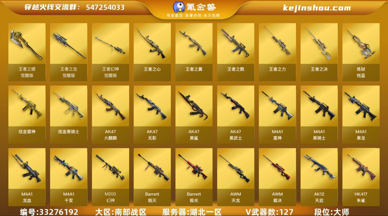 【ky6868】湖北一区-132V-10王者武器数-9炫金武器数 【热门武器】:HK417-朱雀*3,M4A1-青龙,M200-幻神*2,死亡之眼,金色小号,C.A.T,M4A1-黑骑士*2,汤姆逊-烈龙*13,RPK-盘龙*6,加特林-炼狱,沙鹰-修罗*7 【王者炫金武器】:王者之戮,王者之翼,王者之心,王者之决,王者之力*2,炼狱-悦蓝,炫金骑士*3,炫金雷神*6 【音效卡】:M4A1-黑骑士音效卡,Barrett-毁灭音效卡*2 【皮肤】:雷神-星空*3,雷神-虎将,火麒麟-冠军之心,毁灭耀金皮肤*2,毁灭-CFS2020,黑龙-能量核心,黑骑士耀金皮肤*3,无影耀金皮肤*3,天龙-能量核心,AWM-天龙-传奇白鲨,极光-能量核心,修罗-能量核心*2 【角色】:魅影,王者-零-国色天香,炽天使,风暴女,娟娟,零-水下丽影,青霞仙子,樱-战斗天使,雅典娜 【人偶武器】:火麒麟-灵狐*2,M37-葵,C.A.T 【暴走生化】:死亡之眼 【英雄级武器】:M4A1-千变*8,AK47-火麒麟*5,M4A1-黑龙*5,M4A1-雷神*5,M4A1-黑骑士*2,AK47-无影*9,AK47-黑武士*5,AK12-天启*3,AK47-黑鲨*3,M4A1-龙血*6,M4A1-青龙,HK417-朱雀*3,9A91-烈火*6,AWM-天龙*6,Barrett-毁灭*6,Barrett-极光,AWM-裁决*3,M200-幻神*2,Barrett-金色蔷薇,王者幻神-觉醒...
