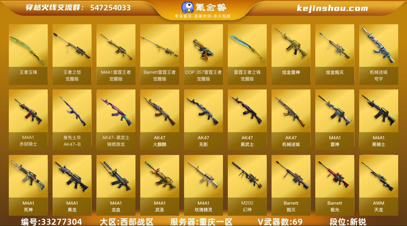 【ky6862】重庆一区-88V-44王者武器数-2炫金武器数 【热门武器】:M200-幻神,M200-竞技荣光,荣耀世冠-火麒麟,M4A1-黑骑士,汤姆逊-烈龙,USP-雷暴,沙鹰-修罗*2 【王者炫金武器】:王者玉锋,高爆手雷-雷霆王者*10,烟雾弹-雷霆王者*6,闪光弹-雷霆王者*12,炫金雷神,炫金毁灭 【音效卡】:M4A1-雷神音效卡,M4A1-黑龙音效卡,Barrett-毁灭音效卡,Barrett-碧霄极光音效卡*3 【皮肤】:雷神-暗月,雷神-能量核心,雷神-荣耀之魄,雷神-虎将,雷神-宠儿-2019MVP,雷神-机甲刑天皮肤,火麒麟-华夏之心*2,火麒麟-盘古,火麒麟-百城,火麒麟-心动糖果,毁灭-暗月,毁灭耀金皮肤,毁灭-战神张飞,毁灭-秦师 皮肤,毁灭-英雄计划 皮肤,黑龙-能量核心,黑龙-暗月,M4A1-黑龙-361,黑骑士-暗月,黑骑士-伏羲,无影-能量核心*2,死神-秘银,AK47-黑武士-361,战神-流金岁月皮肤,天龙-能量核心*2,AWM-天龙-传奇70KG,AWM-天龙-传奇白鲨,极光-能量核心,修罗-能量核心,修罗-星空,天神-暗月 【角色】:葵,炫,电竞教官-云悠悠,兰-巾帼英雄,零·纪元,王者之瞳,王者凌霄,王者涂鸦,乔伊教练,修道士,初恋灵狐,嘉年华灵狐,灵狐-花神,灵狐者-七夕宝贝,龙儿-小淘气,潘多...