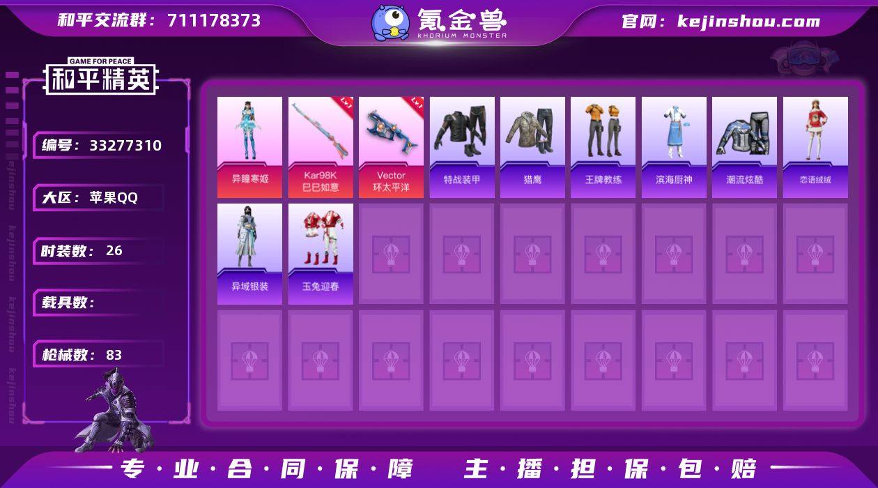 HX9480【粉装-幻彩电音-角色-异瞳寒姬-5特效枪2粉装-3王牌印记-身法素材号】苹果 手Q-2粉装-5特效枪-0载具-2粉色飞行器-25892热力值-3王牌印记-46套装-83枪皮 【粉色套装】:粉装-幻彩电音,角色-异瞳寒姬 【粉色枪皮等级】:Vector-环太平洋(四级),Kar98K-巳巳如意(五级),Mk14-福马献瑞(五级),AA12-G-萌骑幻想(二级),DP-28-豹影疾电(五级) 【粉色枪皮】:Vector-环太平洋,Kar98K-巳巳如意,Mk14-福马献瑞,AA12-G-萌骑幻想,DP-28-豹影疾电 【粉色飞行器】:炫彩糖果飞行器,智趣喵喵飞行器 【粉色降落伞】:绯穹魔姬降落伞【粉色枪皮等级】:Vector-环太平洋(四级),Kar98K-巳巳如意(五级),Mk14-福马献瑞(五级),AA12-G-萌骑幻想(二级),DP-28-豹影疾电(五级) 【粉色枪皮】:Vector-环太平洋,Kar98K-巳巳如意,Mk14-福马献瑞,AA12-G-萌骑幻想,DP-28-豹影疾电 【粉色飞行器】:炫彩糖果飞行器,智趣喵喵飞行器 【粉色降落伞】:绯穹魔姬降落伞,喜羊羊与灰太狼降落伞,炫彩糖果降落伞苹果Q区-2粉装-5特效枪-25892热力值-3王牌印记-46套装-83枪皮【优质套装】: 异瞳寒姬 幻彩电音【特效枪等级】:Kar98K-巳巳如意(五级- Kar98K-巳巳如意)Vector-环太平洋(四级- Vect...
