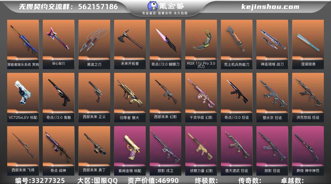 MWW582【英雄28 皮肤96 总资产46990 奇点2.0套装 西部未来套装】【游戏等级】Lv144 【段位】 白银II 【R点】1,200 【皮肤总价值】46,990 【英雄数量】28 【皮肤数量】96 【挂饰数量】79 【卡面数量】126 【喷漆数量】121 【莽侠】莽侠-神中神罚 莽侠-甜心猎手 莽侠-月球哨兵 【狂徒】狂徒-洪荒怒焰 狂徒-超集系统 狂徒-掠影 狂徒-幻心猎手 狂徒-瑰梦艺语 狂徒-诡秘蛇影 狂徒-虚空遗器 狂徒-堕天遗武 狂徒-塑水宗 狂徒-荒土机兵 狂徒-奇点//2.0 【近战武器】近战武器-蒙太奇战斧 近战武器-碎心裂刃 近战武器-神圣领域战刀 近战武器-黑波之刃 近战武器-未来开拓者 近战武器-荒土机兵热能刀 近战武器-澄湖潋滟 近战武器-RGX11zPro//3.0爪刀 近战武器-奇点//2.0蝴蝶刀 【幻影】幻影-蒙太奇 幻影-甜心猎手 幻影-星际猎兵 幻影-千灵华绽 幻影-神圣领域 幻影-西部未来 幻影-纳米打击 幻影-侦察力量 【战神】战神-蒙太奇 战神-光环序列 战神-神圣领域 战神-奇点 【骇灵】骇灵-蒙太奇 骇灵-无限竞技 骇灵-瑰梦艺语 骇灵-星云暗涌 骇灵-荒土机兵 【标配】标配-超集系统 标配-阿特拉斯指挥部 标配-折光棱晶 标配-VCT25xLEV 标配-紫阙金琅 标配-荒土机兵 【戍卫】戍卫-风暴之子 戍卫-甜心...
