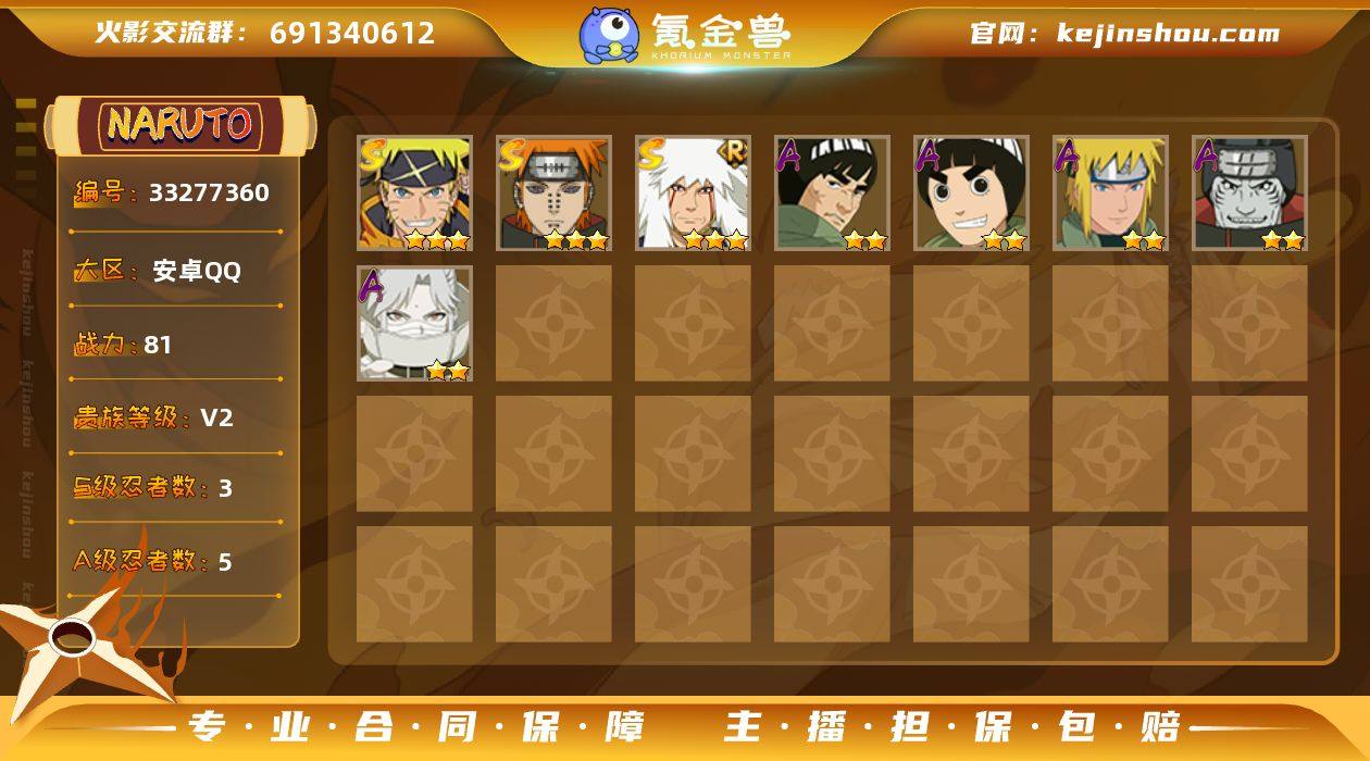 3S级忍者数-5A级忍者数 【S级忍者】:自来也「舞之豪杰」(3星),佩恩「天道」(3星),漩涡鸣人·宇智波佐助(3星) 【A级忍者】:波风水门「青年」(2星),干柿鬼鲛(2星),卑留呼「火之意志继承者」(2星),李洛克「忍界大战」(2星),迈特凯「青春爆炸」(2星)