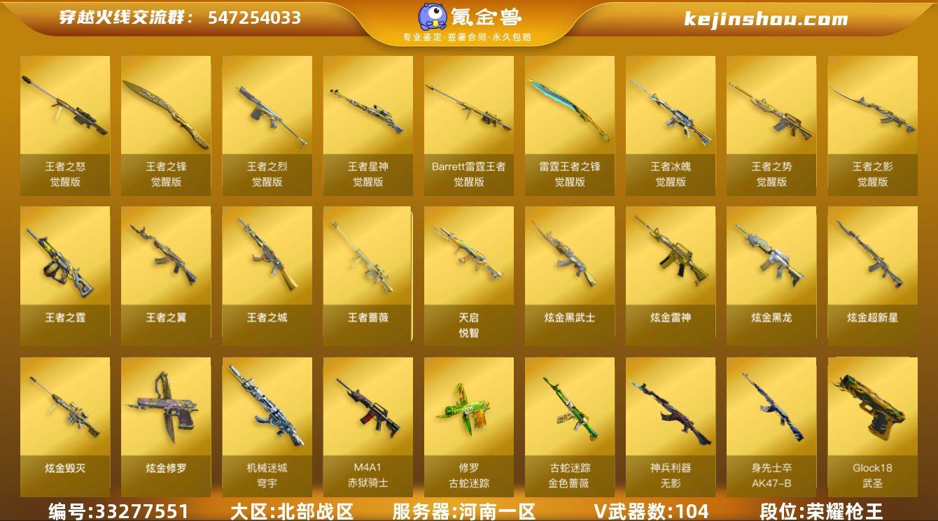 【ky6828】河南一区-118V-19王者武器数-10炫金武器数 【热门武器】:QBZ03-金色蔷薇,Scar Light-白虎,HK417-朱雀,M200-幻神,金色蔷薇-古蛇迷踪,修罗-古蛇迷踪,死亡之眼*3,金色小号,C.A.T,M4A1-黑骑士*2,汤姆逊-烈龙*6,RPK-盘龙*6,加特林-炼狱,USP-钞能力灵狐,羊驼玩偶,沙鹰-修罗,炽芒蝶刃 【王者炫金武器】:王者之城,天启-悦智,王者之翼,王者蔷薇,王者之霆,高爆手雷-雷霆王者,烟雾弹-雷霆王者,炫金黑龙*3,炫金雷神,炫金武士,炫金超新星,炫金毁灭,炫金修罗*3 【音效卡】:M4A1-雷神音效卡,M4A1-黑龙音效卡,M4A1-黑骑士音效卡,Barrett-毁灭音效卡,枪娘语音包-阿敏 【皮肤】:幻神-曹操 皮肤,雷神-暗月,雷神-源计划2.0专属 皮肤,火麒麟-雷神,火麒麟-平天大圣,火麒麟-心动糖果,毁灭-星空,毁灭-战神张飞,毁灭-黑大圣皮肤,毁灭-风暴,毁灭-魔灵皮肤,毁灭-直播专属,黑龙-暗月,无影-能量核心,战神-粉色甜心皮肤,战神-紫绶金章皮肤,战神-流金岁月皮肤,AK47-B-常胜将军-刘备*3,AK47-B-常胜将军-孙权,修罗-能量核心,修罗耀金皮肤 【角色】:零,樱,炫,电竞教官-云悠悠,王者樱-热浪之夏,王者-葵-貂蝉,王者葵-惊若翩鸿,王者之瞳...