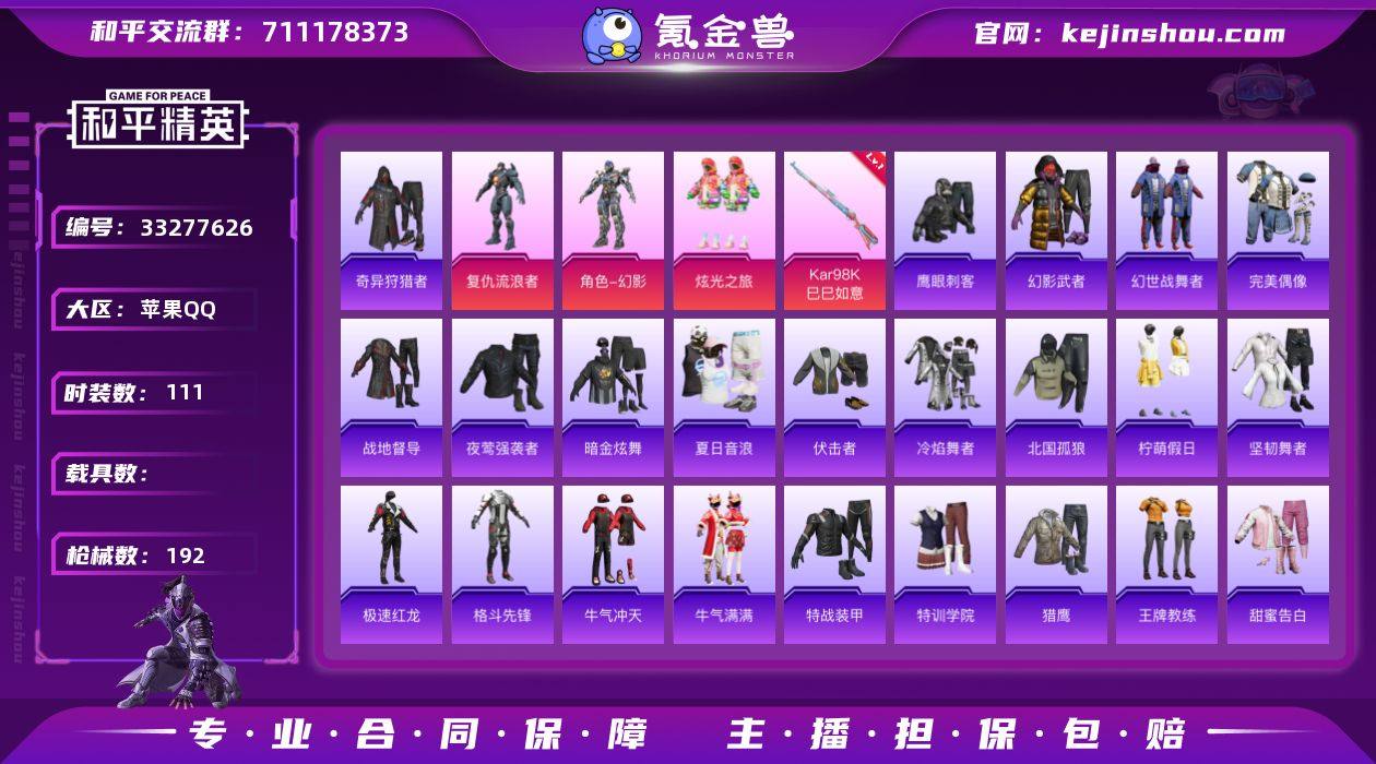 XQ1242+【复仇流浪者 炫光之旅 奇异狩猎者 雪山精英 海上生明月 地铁天赋已开 4特效 2太阳 可二次】苹果Q区-2粉装-4特效枪-52712热力值-11王牌印记-153套装-192枪皮【优质套装】: 复仇流浪者 炫光之旅【特效枪等级】:Kar98K-巳巳如意(五级- Kar98K-巳巳如意)【优质武器皮肤】: Kar98K-巳巳如意【稀有武器皮肤】: QBZ-纯真浪花 AWM-纯真浪花 汤姆逊-纯真浪花 DBS-乌木金纹 AA12-G-纯真浪花 平底锅-纯真浪花 SCAR-L-海盐豹豹 Kar98K-巳巳如意 SLR-极冰使者 野牛-雏菊兔兔 平底锅-雏菊兔兔 AKM-虎虎生威 AKM-恐龙拽拽 AKM-萌趣颜团子 AKM-霓虹街区 SCAR-L-红色方程式 QBZ-彩虹符号 M762-彩虹符号 M762-绯红前夜 M762-牛气冲天【其他套装】: 复仇流浪者 炫光之旅 创世·幻影 奇异狩猎者 雪山精英 白糯汤圆 街头风暴 星途旅人 SS30特训 战术大师 雏菊兔兔 蝶变 元素星魂 SS28特训 SS29特训 萝兰蝴蝶 SS5特训 SS16特训 金鼠迎春 福星高照 雪兔飞飞 夏日音浪 龙的传人 SS8特训 特训学院 猎鹰 青年教官 橘黑制服 红色运动 黄色运动 蓝色运动 黄色伏地魔 白色伏地魔 热血青春 登山爱好者 SS9特训 阳光火鸡 黄色名流 顽皮玉兔 绯格组合 伏击者 酷萌兔限定 漫步者 热情海星 黑色伏地...