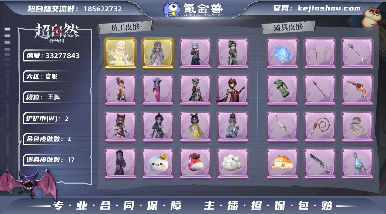 金皮2紫皮11 ;皮肤:薇薇安-圣光之谕,兰-春之声,薇薇安-仙锋小姐,爱德华-梵卓之礼,爱丽丝-丝缕哀歌,零-磨砺成锋,阿念-庆宴绮愿,爱丽丝-耀眼的你,小黄-呱呱雨衣,艾伦-黎明猎手,逍遥-绣春逍影,阿念-王子与骑士,莉莉-莓果陷阱 道具:短管猎枪-星光的裁决,长枪-罪棘,音响-happy猫,音响-鸣沙鼓,长鞭-缚誓之锁,夜视仪-金丝眼镜,转轮手枪-新星时代,黄牛能量饮料-青玉抱丹,除颤仪-冰晶般的代价,腰包-红运福虎,刺刀-碧络琅环,喷气背包-乘风溯雪,夜视仪-敛花容,长鞭-小狗蛇点点鞭,铲子-撒拉弗的祷告,闪光弹-金戈玄铜,急救包-蔷薇物语;饰品:头饰-雪墩墩头套,头饰-腊肠扭扭,头饰-芝麻糊汤圆,头饰-萨卡班甲鱼头套,头饰-饺饺者头套,头饰-鳄霸天头套,头饰-惊魂南瓜头套,头饰-樱桃奶油布丁,头饰-烛光纪念,头饰-炙热烧烤,头饰-卑微头套,头饰-马上有钱,头饰-火爆了头套,头饰-蒜了八,头饰-面具马头套,头饰-滑稽头套,头饰-哈士奇头套,头饰-太空鲨头套,头饰-呆滞头套,头饰-鱼头怪头套,头饰-嘻嘻头套,头饰-烈焰红唇头套,头饰-大葱明头套,头饰-像素朋克墨镜,头饰-后室幸存者头套, 挂饰-拂云仙,挂饰-天使消失的年代,挂饰-钗头凤,挂饰-孤独...