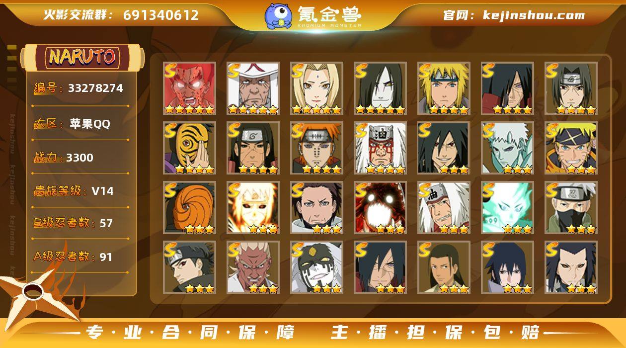 【满s 高战力 微氪1.6w】y7610 战力3300w 57s 92a 6个98通灵 1个328a 2个298a 26个198a 4200金币 880点券 198忍法帖已开212级 传说时装差个凯 7个a忍传承时装 最终章主场景 4个个性名片 五星大蛇丸 纲手 死门凯 三代火影 7个四星s忍