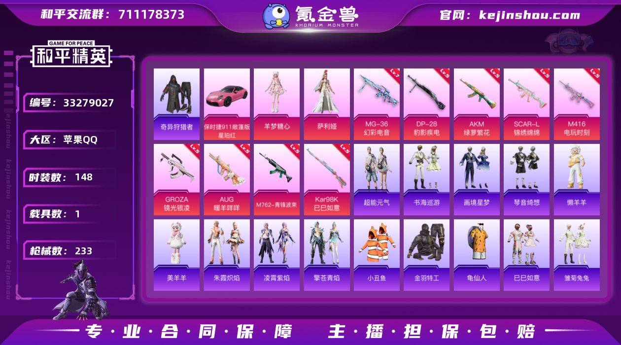 苹果 手Q-2粉装-11特效枪-1载具-2粉色飞行器-63770热力值-17王牌印记-148套装-233枪皮 【热门品类】:套装-小丑鱼,套装-奇异狩猎者,套装-金羽特工,套装-龟仙人 【粉色套装】:角色-萨利娅,角色-羊梦糖心 【粉色枪皮等级】:AKM-绿萝繁花(五级),SCAR-L-锦绣绵绵(五级),M416-电玩时刻(五级),GROZA-镜光银凌(五级),AUG-暖羊咩咩(五级),M762-青锋波束(五级),Kar98K-巳巳如意(五级),Mk14-福马献瑞(五级),AA12-G-萌骑幻想(五级),DP-28-豹影疾电(五级),MG-36-幻彩电音(七级) 【粉色载具】:保时捷911 敞篷版(星珀红) 【粉色枪皮】:AKM-绿萝繁花,SCAR-L-锦绣绵绵,M416-电玩时刻,GROZA-镜光银凌,AUG-暖羊咩咩,M762-青锋波束,Kar98K-巳巳如意,Mk14-福马献瑞,AA12-G-萌骑幻想,DP-28-豹影疾电,MG-36-幻彩电音 【粉色飞行器】:炫彩糖果飞行器,夜幕颂歌飞行器 【粉色降落伞】:绝对恒星降落伞,星之彼岸降落伞,洛神天依降落伞,第五大道降落伞,仲夏莫吉托降落伞,圣堂之誓降落伞,鬼刀降落伞,墨金战记降落伞,星穹咏叹调降落伞,喜羊羊与灰太狼降落伞,炫彩糖果降落伞 【稀有套装】:套装-龟仙人,套装-巳巳如意,套装-超能元气,套装-雪国风尚,套装-炫彩...
