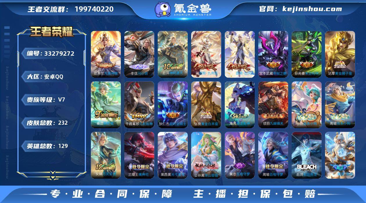 【V7对抗路男神号·花木兰九霄神辉·李信问心剑·10传说·232皮肤·物超所值·手慢无】安卓Q-V7-至尊星耀III段位-129英雄-232皮肤-1典藏皮肤-1无双-10传说-75史诗 【英雄全皮】:敖隐全皮,蒙恬全皮,司空震全皮 【荣耀典藏】:花木兰九霄神辉 【无双皮肤】:李信问心剑 【传说皮肤】:后羿神树通天,司空震愿照山河定,澜愿照九州拓,桑启鸣野蒿,张良黄金白羊座,干将莫邪久胜战神,达摩黄金狮子座,孙尚香末日机甲,宫本武藏地狱之眼,狄仁杰超时空战士 【限定皮肤】:蒙犽顽岩魄,蔡文姬夏日便利店,虞姬夏日便利店,姜子牙天穹之誓,杨戬破阵退雄兵,狄仁杰阴阳师,赵云皇家上将,高渐离死亡摇滚,吕布猎兽之王,元歌无心,狄仁杰魔术师,狄仁杰万华元夜,达摩星际陆战队,达摩沙漠行僧,项羽海滩派对,老夫子醍醐杖,程咬金演武夺筹,兰陵王金庭之子,孙悟空至尊宝,孙悟空孙行者,李元芳云中旅人,干将莫邪胡桃夹子,雅典娜黎明之约,太乙真人华丽摇滚,苏烈千军破阵,梦奇顽趣,沈梦溪大漠名商,裴擒虎李小龙,裴擒虎擒涛扼浪,云中君纤云弄巧,嫦娥暖冬兔眠,西施玲珑珍味,鲁班大师探海日志,桑启海盐诗旅,戈娅驭风魔法,司空震地狱燃心,张良古海寻踪,蒙恬荣光圣徽,高...