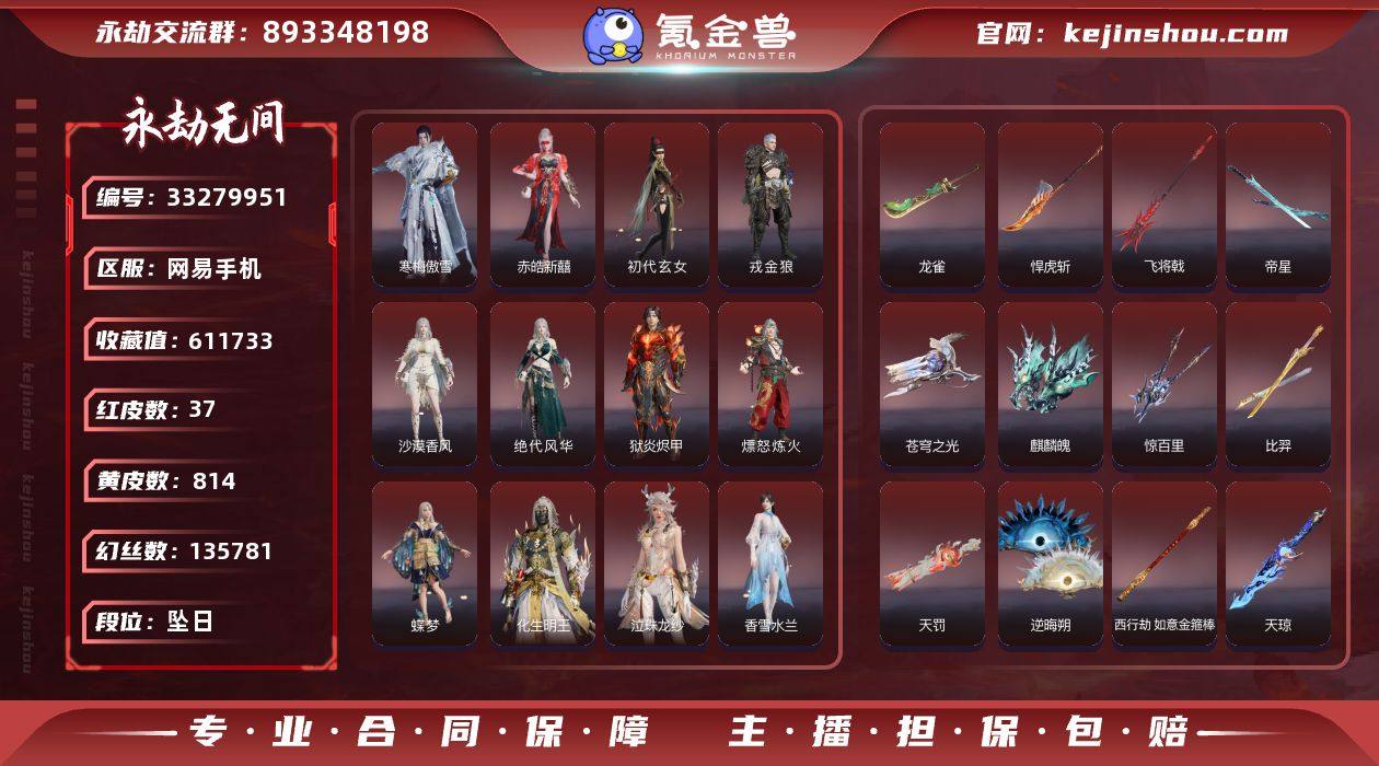 37红814金, 技能奥义12, 总收藏值611733, 幻丝135781, 等级473, 三排黄金4, 通行证未升级Lv.8, 双马尾女双马尾男, 37红色神品: 赤皓新囍/初代玄女/星辉魔纱/化生明王/戎金狼/狱炎烬甲/熛怒炼火/蝶梦/泣珠龙纱/香雪水兰/绝代风华/沙漠香风/监兵凶神/夜魅游莹/通天狐袄/执明神君/流金晓锦/守墨麒/命定之辉/逐光者/寒梅傲雪/麒麟魄/少阳剑/帝星/比羿/狼主/龙雀/悍虎斩/飞将戟/如意金箍棒/天琼/逆晦朔/狂龙/惊百里/天罚/苍穹之光/墨离, 详情见图