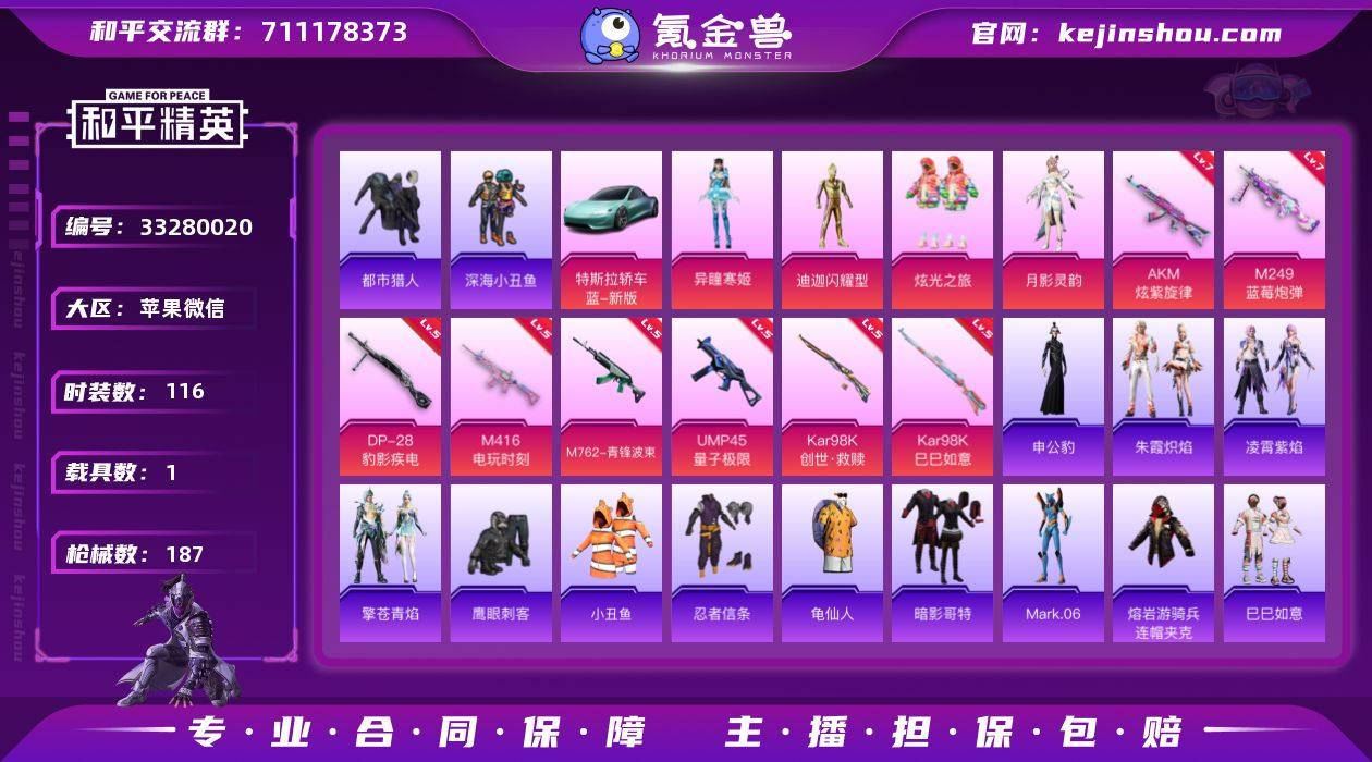 【特价出售/店主推荐】苹果 微信-4粉装-11特效枪-1载具-6粉色飞行器-58058热力值-12王牌印记-116套装-187枪皮 【热门品类】:套装-都市猎人,套装-深海小丑鱼,套装-小丑鱼,套装-忍者信条,套装-龟仙人,套装-暗影哥特,角色-Mark.06,熔岩游骑兵连帽夹克 【粉色套装】:角色-闪耀迪迦,粉装-炫光之旅,角色-月影灵韵,角色-异瞳寒姬 【粉色枪皮等级】:AKM-炫紫旋律(七级),M416-电玩时刻(五级),M762-青锋波束(五级),ACE32-萌骑漫游(五级),UMP45-量子极限(五级),AKS-74U-森灵之息(五级),Kar98K-创世·救赎(五级),Kar98K-巳巳如意(五级),Mk14-福马献瑞(五级),M249-蓝莓炮弹(七级),DP-28-豹影疾电(五级) 【粉色载具】:特斯拉Roadster(水滴蓝) 【粉色枪皮】:AKM-炫紫旋律,M416-电玩时刻,M762-青锋波束,ACE32-萌骑漫游,UMP45-量子极限,AKS-74U-森灵之息,Kar98K-创世·救赎,Kar98K-巳巳如意,Mk14-福马献瑞,M249-蓝莓炮弹,DP-28-豹影疾电 【粉色飞行器】:炫彩糖果飞行器,鎏金朋克飞行器,星空武士飞行器,幻星舰长飞行器,时光之吻飞行器 【粉色降落伞】:幻影战神降落伞,百万伏特降落伞,银刃赛罗降落伞,星之彼岸降落伞,蓝莓炮弹降落伞,筑梦精灵降落...