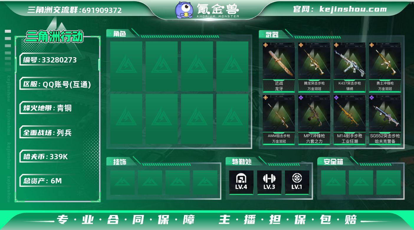 【SJZF7580】总资产6M/哈夫币33万/传说近战数1/传说枪皮数4/战场等级24/行动等级54/安全箱等时效性道具以游戏内数据为准,详情请看图/近战-龙牙/近战-处刑者3级/近战-黑鹰/腾龙突击步枪-万金泪冠/K437突击步枪-锦绣/勇士冲锋枪-万金泪冠/AWM狙击步枪-万金泪冠/AUG突击步枪-蝮蛇/SG552突击步枪-哈夫克警备/MP7冲锋枪-六套之力/S12K霰弹枪-曙光/PKM通用机枪-蝮蛇/M14射手步枪-工业狂潮/M700狙击步枪-哈夫克警备/沙漠之鹰-曙光/AS Val突击步枪-休闲时光/K416突击步枪-一帆风顺/SG552突击步枪-2026/ AK-12突击步枪-马年新春/SCAR-H战斗步枪-荣耀列队/MP5冲锋枪-哈夫克卫队/SMG-45冲锋枪-行动开启/SMG-45冲锋枪-幻影结构/勇士冲锋枪-冰天雪地/QCQ171冲锋枪-银鹭/M1014霰弹枪-幻影结构/S12K霰弹枪-前沿科技/M249轻机枪-毛鲁斯之力/M249轻机枪-冰天雪地/QJB201轻机枪-哈夫克卫队/Mini-14射手步枪-荣耀列队/QSZ92G-一帆风顺/AUG突击步枪-猛兽/勇士冲锋枪-彩墨涂鸦/M4A1突击步枪-粉色涂装/M4A1突击步枪-高雅黑/QBZ95-1突击步枪-海浪/QBZ95-1突击步枪-海色/QBZ95-1突击步枪-2026/腾龙突击步枪-三角洲力量/K416突击步枪-几何迷彩/K416突击步枪-高雅黑/M16A4突击步枪-高雅黑/AUG突击步枪-...