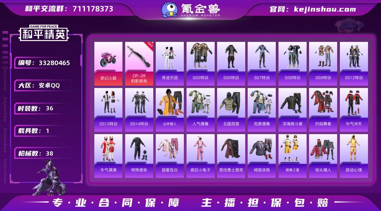 安卓 手Q-0粉装-1特效枪-1载具-0粉色飞行器-11629热力值-1王牌印记-36套装-38枪皮 【粉色枪皮等级】:DP-28-豹影疾电(一级) 【粉色载具】:双人摩托-梦幻火箭 【粉色枪皮】:DP-28-豹影疾电 【粉色降落伞】:精灵迷巫降落伞,梦幻火箭降落伞 【稀有枪皮】:AKM-夜灯,SCAR-L-炫彩节奏,SCAR-L-红色方程式,M416-绯红前夜,M416-蓝色火焰,GROZA-暗夜武装,GROZA-黑色刀锋,AUG-魔法学院,M762-牛气冲天,UZI-天降萌叽,UZI-魔法学院,UMP45-蓝色火焰,Vector-彩虹符号,Vector-生命誓言,Vector-黑色刀锋,Kar98K-彩虹符号,Kar98K-梦幻火箭,SKS-夜灯,VSS-黑色刀锋,Mini14-炫彩节奏,DBS-彩虹符号,M249-破晓战魂,MG3-幻世战舞者,短管霰弹-星穹咏叹调 【其他套装】:套装-SS5特训,套装-SS6特训,套装-SS7特训,套装-SS8特训,套装-SS9特训,套装-SS12特训,套装-SS13特训,套装-SS14特训,套装-丛林猎人,套装-人气偶像,套装-北国孤狼,套装-奇迹天团,套装-完美偶像,套装-深海格斗者,套装-灼焰舞者,套装-牛气冲天,套装-牛气满满,套装-特殊使命,套装-甜蜜告白,套装-疯狂小兔子,套装-竞技勇士朋克,套装-绮丽涂鸦,套装-萌黄之夏,套装-街头潮人,套装-跃动心情...
