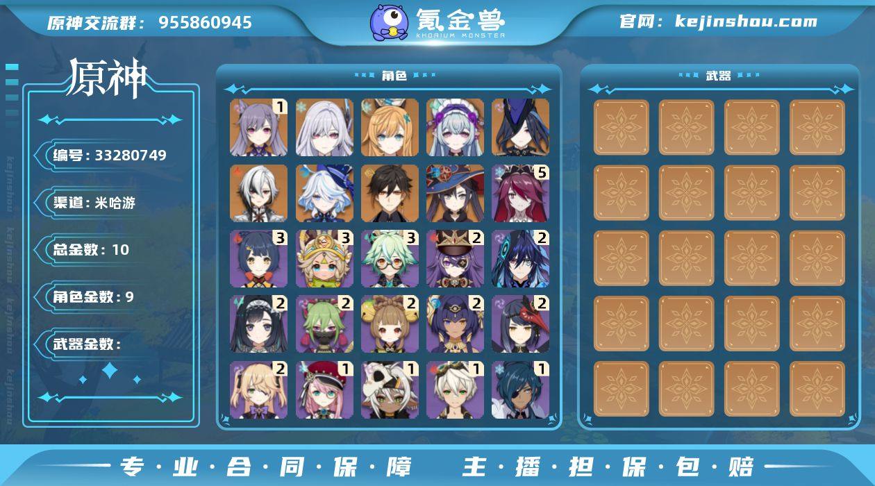 10黄! 冒险等级: 55 1命金色角色: 一命刻晴 0命金色角色: 钟离,莫娜,芙宁娜,阿蕾奇诺,克洛琳德,梦见月瑞希,爱可菲,丝柯克