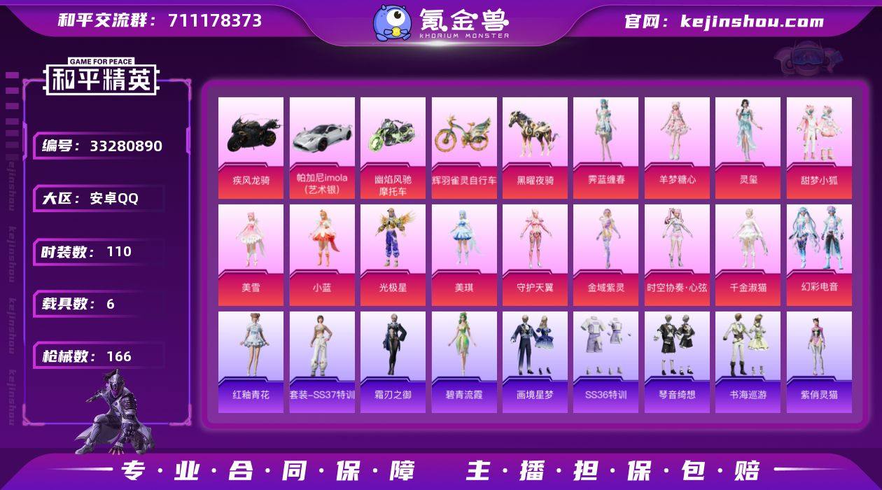 【和平精英】16粉装,15特效枪,8载具,历史最高段位:超级王牌18星 王牌印记12次 热力值:107308,186套装,289枪械,441装备,172战备;套装:沙丘之主-图卡盟,套装-梦幻火箭,套装-甜梦小狐,角色-光极星,角色-小蓝,角色-美雪,角色-美琪,角色-守护天翼,时空协奏·心弦,角色-金域紫灵,角色-千金淑猫,角色-霁蓝缠春,套装-幻彩电音,角色-羊梦糖心,角色-灵玺,角色-奇迹舞步 美雪,角色-奇迹舞步 美琪,套装-特训学院,套装-黑色伏地魔,套装-竞技名士,套装-湖蓝色名流,套装-黄色名流,套装-长空猛禽,套装-漫步者,套装-海岛探路者,套装-旭日情侣,套装-特战装甲,套装-青春校园,套装-春日漫步,套装-鹰眼刺客,套装-冰冻风暴,套装-街头潮人,套装-魅力单车,套装-耀眼新星,套装-破晓战魂,套装-荣耀,套装-潮流炫酷,套装-烈火街头,套装-弄潮海豚,套装-迅捷狂鲨,套装-呆萌铁蟹,套装-青涩时光,套装-缤纷果语,套装-滨海厨神,套装-龙魂突击队,套装-元素星魂,套装-麻辣教官,套装-小丑鱼,套装-破蛋小黄鸡,套装-阳光火鸡,套装-顽皮玉兔,套装-AG战队服,套装-牛气满满,套装-白糯汤圆,套装-战术大师,套装-狙击之神,套装-牛气冲天,套装-曼妙人鱼,...