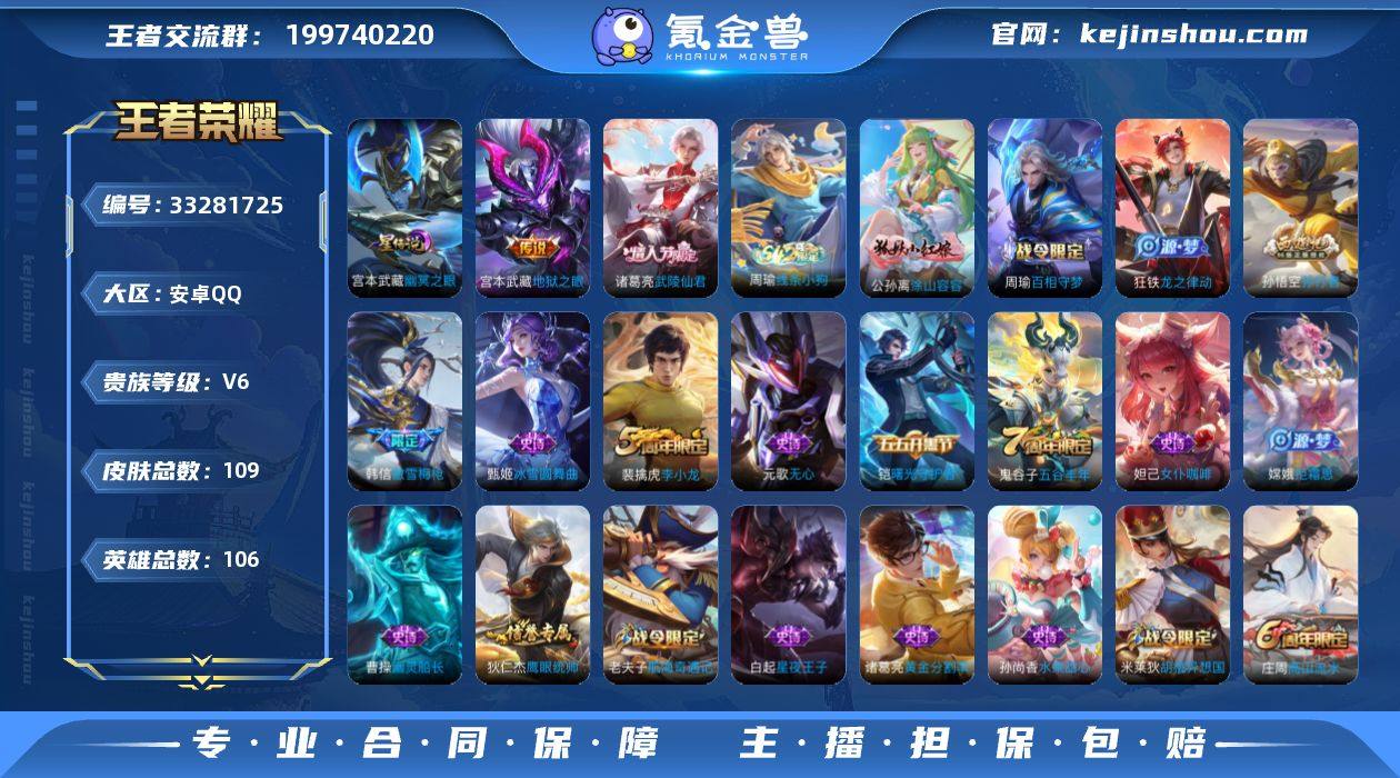 可换绑【精品小号·武陵仙君·傲雪梅枪·孙行者·】 1按键,1星传说,3王者印记,五级铭文150,无二次,安卓Q-V6-109皮肤-2传说-28史诗【英雄全皮】:孙权全皮,空空儿全皮【星元皮肤】:宫本武藏幽冥之眼【传说皮肤】:诸葛亮武陵仙君,宫本武藏地狱之眼【限定皮肤】:狄仁杰阴阳师,赵云皇家上将,墨子神迹守卫,庄周高山流水,高渐离玩趣恶龙,元歌无心,狄仁杰魔术师,狄仁杰万华元夜,达摩星际陆战队,达摩沙漠行僧,项羽海滩派对,老夫子航海奇遇记,程咬金演武夺筹,韩信傲雪梅枪,兰陵王金庭之子,亚瑟潮玩骑士王,孙悟空孙行者,后羿圣弓游侠,李元芳云中旅人,钟馗驱傩正仪,干将莫邪真爱魔法,鬼谷子五谷丰年,诸葛亮武陵仙君,苏烈千军破阵,沈梦溪大漠名商,裴擒虎李小龙,米莱狄胡桃异想国,嫦娥拒霜思,桑启海盐诗旅,张良古海寻踪,鬼谷子天穹祈灯【赛季限定】:狄仁杰万华元夜,程咬金演武夺筹,钟馗驱傩正仪,苏烈千军破阵,达摩沙漠行僧,兰陵王金庭之子,沈梦溪大漠名商,李元芳云中旅人,桑启海盐诗旅,张良古海寻踪,鬼谷子天穹祈灯,甄姬逆浪荇歌【战令限定】:亚瑟潮玩骑士王,米莱狄胡桃异想国,达摩星际陆战队,老夫子航海奇遇记,墨子神迹守卫,干将莫...