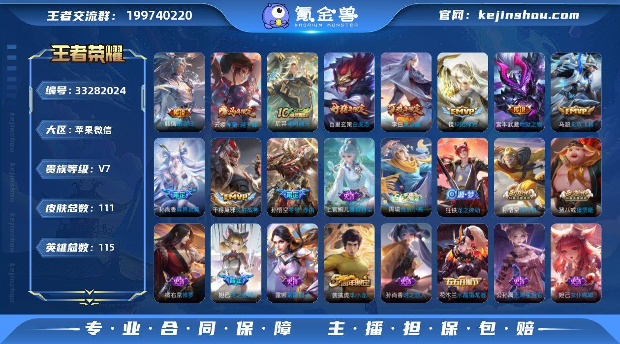 贵族等级: V7 英雄数: 115 皮肤数: 111 传说皮: 久胜战神,炽阳神光,零号·赤焰,地狱之眼,无双飞将,神树通天,神骥·越千峰,踏浪归 限定皮: 李小龙,异界灵契-孙尚香,时之彼端,凤求凰,白虎志,高山流水,孙行者,猪悟能