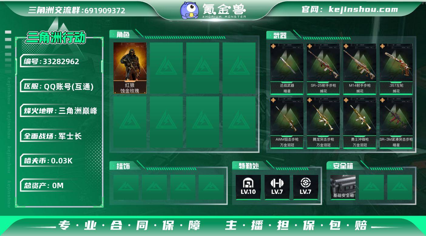 实名: 可修改 烽火地带段位: 三角洲巅峰 全面战场段位: 军士长 总资产: 247 哈夫币: 30 干员外观: 红狼-蚀金玫瑰 传说武器皮肤: M4A1突击步枪-蚀金玫瑰,M4A1突击步枪-阿米娅,CAR-15突击步枪-阿米娅,复合弓-黑-天际线,Vector冲锋枪-狩猎时刻,G3战斗步枪-狩猎时刻,M16A4突击步枪-狩猎时刻,SR-3M紧凑突击步枪-特斯拉线圈,UZI冲锋枪-特斯拉线圈,勇士冲锋枪-能天使-午夜邮差,KC17突击步枪-电锯惊魂,SKS射手步枪-骑士,近战-暗星,MK47突击步枪-暗星,SR-3M紧凑突击步枪-暗星,勇士冲锋枪-万金泪冠,腾龙突击步枪-万金泪冠,AWM狙击步枪-万金泪冠,.357左轮-缄花,SR-25射手步枪-缄花,M14射手步枪-缄花