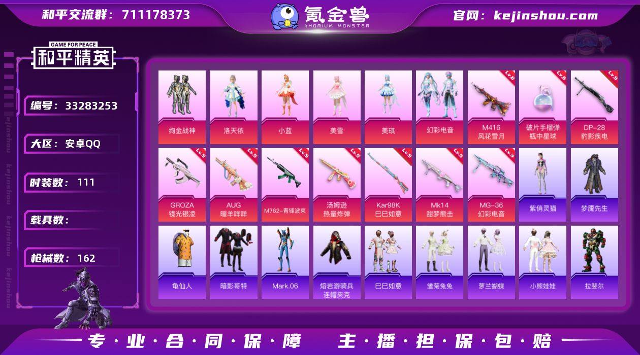 【949110】安卓 手Q-7粉装-10特效枪-0载具-3粉色飞行器-47941热力值-9王牌印记-111套装-162枪皮 【热门品类】:套装-AG战队服,套装-龟仙人,套装-暗影哥特,角色-Mark.06,熔岩游骑兵连帽夹克 【粉色套装】:粉装-绚金战神,角色-洛天依,角色-小蓝,角色-美雪,角色-美琪,粉装-幻彩电音,角色-虎痴许褚 【粉色枪皮等级】:M416-风花雪月(六级),GROZA-镜光银凌(五级),AUG-暖羊咩咩(五级),M762-青锋波束(五级),汤姆逊-热量炸弹(五级),Kar98K-巳巳如意(五级),Mk14-甜梦熊击(五级),DP-28-豹影疾电(五级),MG-36-幻彩电音(三级),破片手榴弹-瓶中星球(六级) 【粉色枪皮】:M416-风花雪月,GROZA-镜光银凌,AUG-暖羊咩咩,M762-青锋波束,汤姆逊-热量炸弹,Kar98K-巳巳如意,Mk14-甜梦熊击,DP-28-豹影疾电,MG-36-幻彩电音,破片手榴弹-瓶中星球 【粉色飞行器】:幻星舰长飞行器,飞天猪飞行器 【粉色降落伞】:精灵梦叶罗丽降落伞,忍者神龟降落伞,千金淑猫降落伞,彩虹独角兽降落伞,墨金战记降落伞,智耀战神降落伞,御兔特攻降落伞,幻彩电音降落伞,时光之吻降落伞,冷漠罗丽降落伞,喜羊羊与灰太狼降落伞,炫彩糖果降落伞 【稀有套装】:套装-龟仙人,套装-巳巳如...