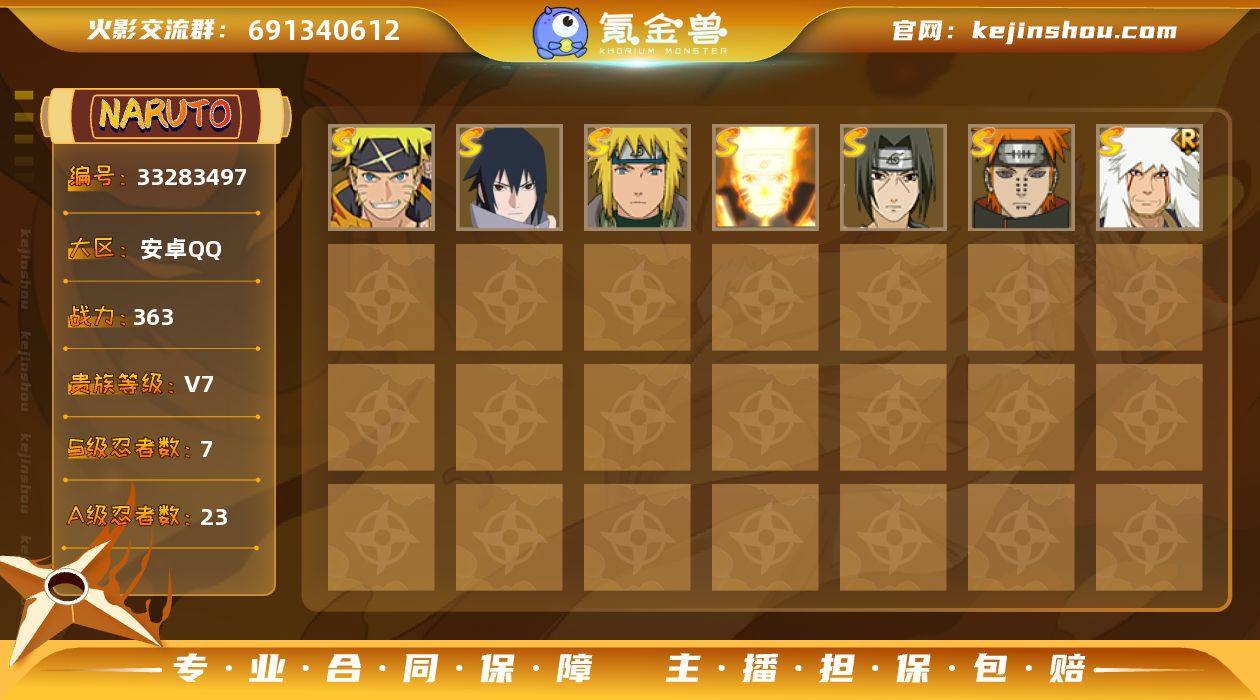 实名: 可修改 贵族等级: V7 S忍数: 7 A忍数: 23 战力值(万): 363 S级忍者: 佩恩「天道」,波风水门,宇智波鼬 「须佐能乎」,自来也 「舞之豪杰」,漩涡鸣人 「九喇嘛连结」,宇智波佐助「永恒万花筒」,漩涡鸣人·宇智波佐助 亮点: 【优质装备】:漩涡鸣人 「九喇嘛连结」,宇智波佐助「永恒万花筒」霸体lv4