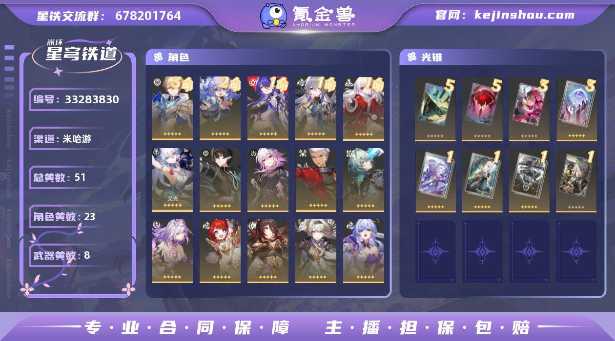 【崩坏·星穹铁道】冒险等级:70,女主,五星数量:31,五星角色:杰帕德 * 3命,白露 * 2命,布洛妮娅 * 1命,克拉拉 * 1命,黄泉 * 1命,景元,瓦尔特,忘归人,缇宝,刃,卡芙卡,丹恒·饮月,遐蝶,藿藿,真理医生,花火,那刻夏,知更鸟,Archer,长夜月,丹恒·腾荒,爻光,流萤__五星光锥:星海巡航 * 5精,记一位星神的陨落 * 5精,以世界之名 * 3精,记忆永不落幕 * 3精,拂晓之前,让告别,更美一些,行于流逝的岸,梦应归于何处__四星角色:貊泽 * 6命,艾丝妲 * 6命,希露瓦 * 6命,桑博 * 6命,三月七 * 6命,青雀 * 6命,佩拉 * 6命,驭空 * 6命,卢卡 * 6命,玲可 * 6命,寒鸦 * 6命,雪衣 * 6命,米沙 * 6命,加拉赫 * 6命,黑塔 * 5命,丹恒 * 4命,桂乃芬 * 4命,阿兰 * 3命,娜塔莎 * 3命,虎克 * 3命,素裳 * 3命,停云 * 1命 0+1遐碟流萤1+1黄泉 24up