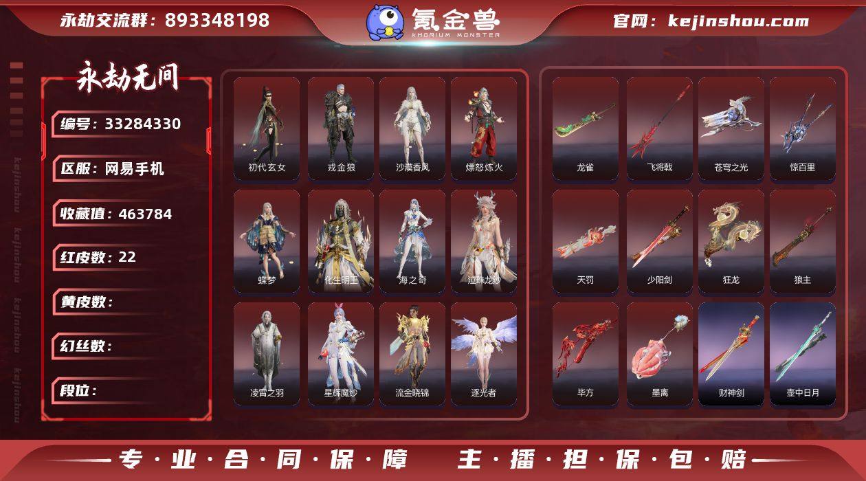YJJ2252/5.6换绑/等级649/s20三人蚀月4/27红738金收藏值463784/27红色神品:/初代玄女/星辉魔纱/化生明王/戎金狼/熛怒炼火/蝶梦/人偶之梦/泣珠龙纱/海之奇/凌霄之羽/沙漠香风/流金晓锦/逐光者/镇渊/少阳剑/太玄之刃/狼主/龙雀/飞将戟/狂龙/龙骧/惊百里/天罚/苍穹之光/毕方/墨离【技能奥义】/初代机/神君印/D.Va小兔徽章/御祥云/星熠 【武技外观】/春雷透·炽/苍龙穿雷透·燧明/碎龙棍·焰/龙武碎空波·炽凰/寂灭斩·烈/寂灭乱鬼刀·朱殷/愤天斩·疾/铁骑愤穹苍·金戈 宁红夜:/初代玄女/倒反阴阳炽羽/夜华朝/碧水青天/相柳/九阴圣女/簪缨发/落霜发/双马尾女 沈妙:/星辉魔纱/秋藏桂/悠竹萌客/绮云衫/咏春/忘忧发/娇憨发/韶光发/NOIR发型/双马尾女 天海:/化生明王/少林/白熊/觉明尊者/若水尊者/悟净/八宝龙王/缘觉发/双马尾男 殷紫萍:/风雨谐/萍之缘/鹅黄纱梦/瑶光沐月/伏苓发/暖绒发/双马尾女 特木尔:/戎金狼/红蓝狂想/唐三/致命玩笑/友情岁月/街头梦语/多闻天王/路奇迷踪/苍狼之主/银狼裘/追猎/海神发/双马尾男 季沧海:/熛怒炼火/信手斩龙/巨阙/鹧鸪天/康复之星/醉山川/江海沧澜/游四海/江海发/含锋发/白狼发/双马尾男 胡桃:/蝶梦/青灯/紫藤神子/星空投影/小舞/承云兰寿/贵胄少女/高校水...