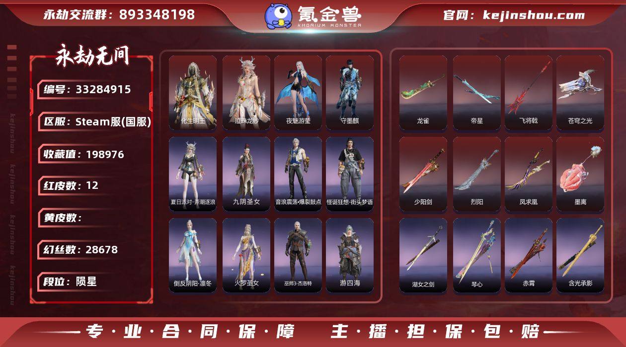 【红皮】:墨离(飞索皮肤),凤求凰(双刀皮肤),烈阳(阔刀皮肤),少阳剑(长剑皮肤),化生明王(天海皮肤),泣珠龙纱(崔三娘皮肤),夜魅游莹(季莹莹皮肤),飞将戟(斩马刀皮肤),守墨麒(张起灵皮肤),苍穹之光(五眼铳皮肤),帝星(横刀皮肤),龙雀(阔刀皮肤) 【外观总数】12红 257金 幻丝:28678金砖: 收藏值:19W 【换绑】:可换绑,期间登录网易大神不影响正常游戏,其他皮肤可参考以下截图,道具、段位以实际验号为准,段位因赛季原因发生变化,以上号为准"