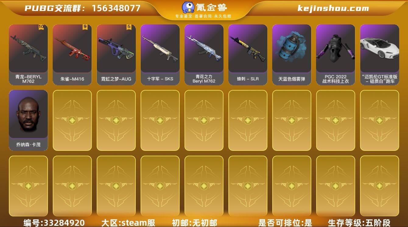 JDPX13786 生存500级可排位/10级青龙-BERYLM762/9级朱雀-M416/5级霓虹之梦-AUG/1级暗影之主-MK12/1级寒蚀-MP5K/迈凯伦硅质白版/粉毛/黑鬼/蓝色烟枪/天蓝色烟雾弹/粉色烟雾弹/金面具/拉风龙-风华套装/红面具/星魂白运动/红鞋/粉色电磁包/ 0BFGXS号 无排名, 生存等级2500, 名誉等级2, 金标数量2, 聚合物170, 枪皮数量149, [成长型] 朱雀 - M416[9级], [成长型] 青龙 - Beryl M762[10级], [成长型] 霓虹之梦 - AUG[5级], “帮派” SUV, “迈凯伦GT标准版 - 硅质白” 跑车
