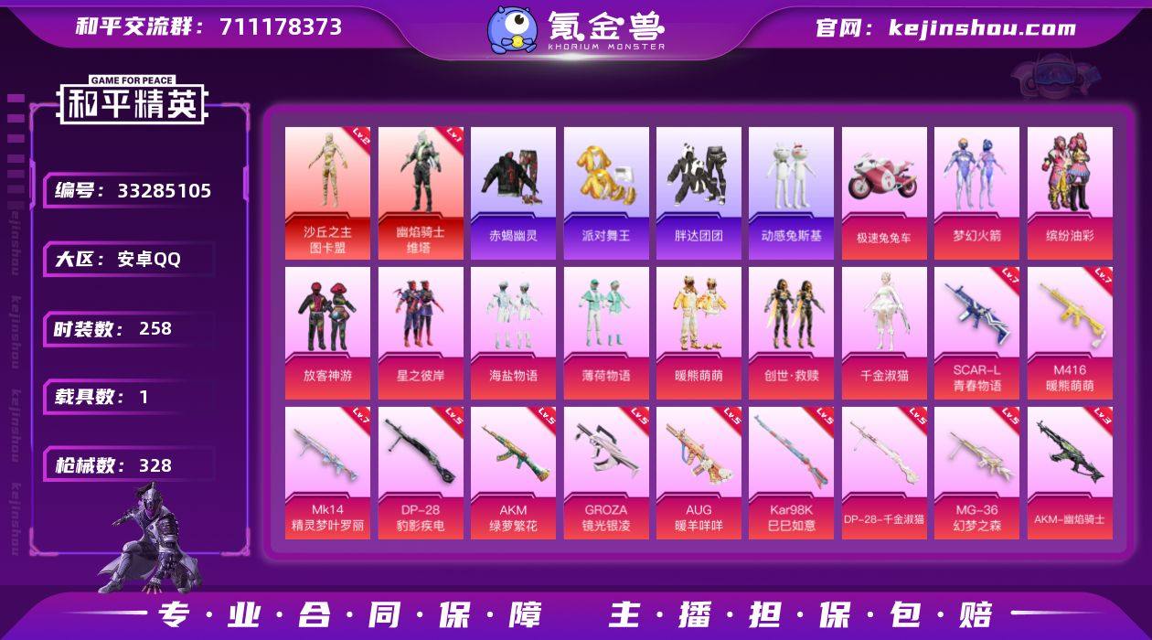 安卓【极品神装号/17王牌印记/沙丘之主-图卡盟(二级)/幽焰骑士-维塔(一级)/梦幻火箭/缤纷油彩/放客神游/赤蝎幽灵/派对舞王/胖达团团/暗影哥特/蓝螳螂/萌熊伴侣背包/2神装-9粉装-15特效枪-1载具-14粉色飞行器】 手Q--108679热力值-17王牌印记-258套装-328枪皮 【红色神装等级】:幽焰骑士-维塔(一级),沙丘之主-图卡盟(二级) 【红色角色神装】:幽焰骑士-维塔,沙丘之主-图卡盟 【热门品类】:粉装-梦幻火箭,粉装-缤纷油彩,套装-浪漫天命,套装-赤蝎幽灵,套装-派对舞王,套装-胖达团团,套装-动感兔斯基人偶服,套装-龟仙人,套装-暗影哥特,套装-浪漫波比,角色-Mark.06,套装-红熊茄茄 【粉色套装】:粉装-梦幻火箭,粉装-缤纷油彩,粉装-放客神游,粉装-星之彼岸,粉装-海盐物语,粉装-薄荷物语,粉装-暖熊萌萌,套装-创世·救赎,角色-千金淑猫 【粉色枪皮等级】:AKM-绿萝繁花(五级),AKM-幽焰骑士(三级),SCAR-L-青春物语(七级),M416-暖熊萌萌(七级),GROZA-镜光银凌(五级),AUG-暖羊咩咩(五级),P90-沙丘之主(三级),Kar98K-巳巳如意(五级),M24-镜域双华(二级),Mk14-精灵梦叶罗丽(七级),Mk14-福马献瑞(一级),SPAS-12-蜜语绒猫(三级),DP-28-千金淑猫(五级),DP-2...
