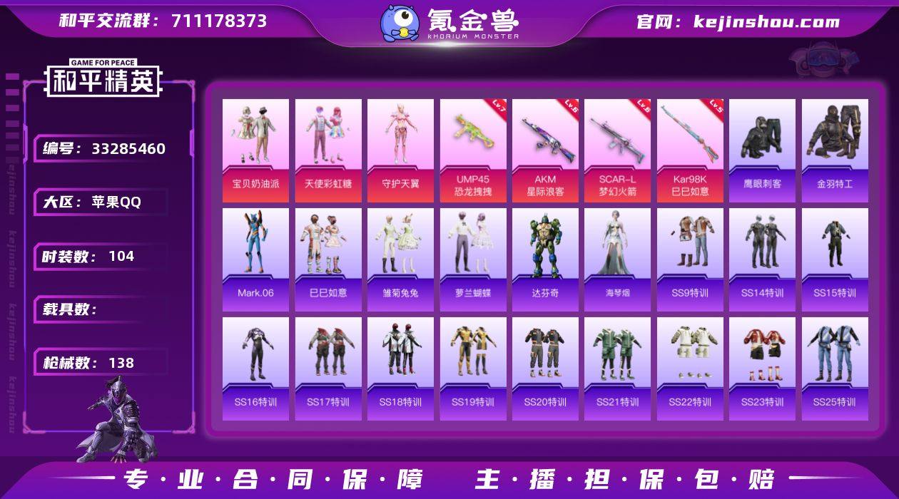 苹果 手Q-3粉装-4特效枪-0载具-1粉色飞行器-45935热力值-13王牌印记-104套装-138枪皮【热门品类】:套装-金羽特工,角色-Mark.06【粉色套装】:粉装-宝贝奶油派,粉装-天使彩虹糖,角色-守护天翼【粉色枪皮等级】:AKM-星际浪客(六级),SCAR-L-梦幻火箭(六级),UMP45-恐龙拽拽(七级),Kar98K-巳巳如意(五级)【粉色枪皮】:AKM-星际浪客,SCAR-L-梦幻火箭,UMP45-恐龙拽拽,Kar98K-巳巳如意【粉色飞行器】:梦幻火箭飞行器【粉色降落伞】:甜心宝贝降落伞,梦幻火箭降落伞,蓝莓炮弹降落伞,歌者泠鸢降落伞,天星战神降落伞,未来领航者降落伞,鬼刀降落伞【稀有套装】:套装-巳巳如意,套装-雏菊兔兔,套装-萝兰蝴蝶,角色-达芬奇,角色-海琴烟【稀有枪皮】:AKM-彩虹符号,AKM-影袭,AKM-恐龙拽拽,AKM-破晓战魂,AKM-萌趣颜团子,AKM-虎虎生威,AKM-龙的传人,M16A4-幻世战舞者,M16A4-甜心亚梦,SCAR-L-炫彩节奏,SCAR-L-红色方程式,M416-绯红前夜,M416-蓝色火焰,GROZA-异彩先驱,GROZA-影袭,GROZA-田园牧歌,GROZA-蓝莓炮弹,AUG-耀粉歌者,QBZ-彩虹符号,QBZ-飞驰魅影,M762-奇异狩猎者,M762-瑞龙福将,G36C-时空追击者,AC-VAL-天降萌叽,AC-VAL-甜心亚梦,蜜獾-天...