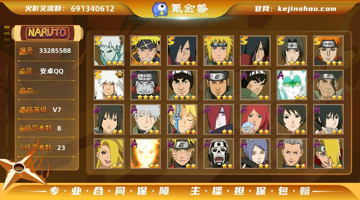 V7/S忍8/A忍23/三星S-宇智波斑「秽土转生」/四星A-干柿鬼鲛/二星A-我爱罗「疾风传」/三星S-宇智波带土「十尾人柱力」/二星A-飞段「死司凭血」/二星A-长门「青年」/2星小南「神驹佑将」/二星A-蝎/三星S-佩恩「天道」/三星S-漩涡鸣人·宇智波佐助/三星S-波风水门/二星A-漩涡博人「桃式显现」/二星A-土台「忍界大战」/三星S-自来也「舞之豪杰」/四星A-迈特凯/二星A-黑土「四代目土影」/二星A-迪达拉「秽土转生」/二星A-飞段/二星A-漩涡鸣人「仙人模式」/二星A-不风/二星A-宇智波泉奈/二星A-迪达拉/二星A-旗木卡卡西 「幻之真容」/二星A-巳月「仙人模式」/二星A-小南/三星S-宇智波斑「秽土转生·解」/二星A-漩涡鸣人「九尾查克拉」/三星A-猿飞阿斯玛/二星A-迈特凯「青春爆炸」/二星A-宇智波佐助「须佐能乎」/三星S-宇智波鼬 「须佐能乎」