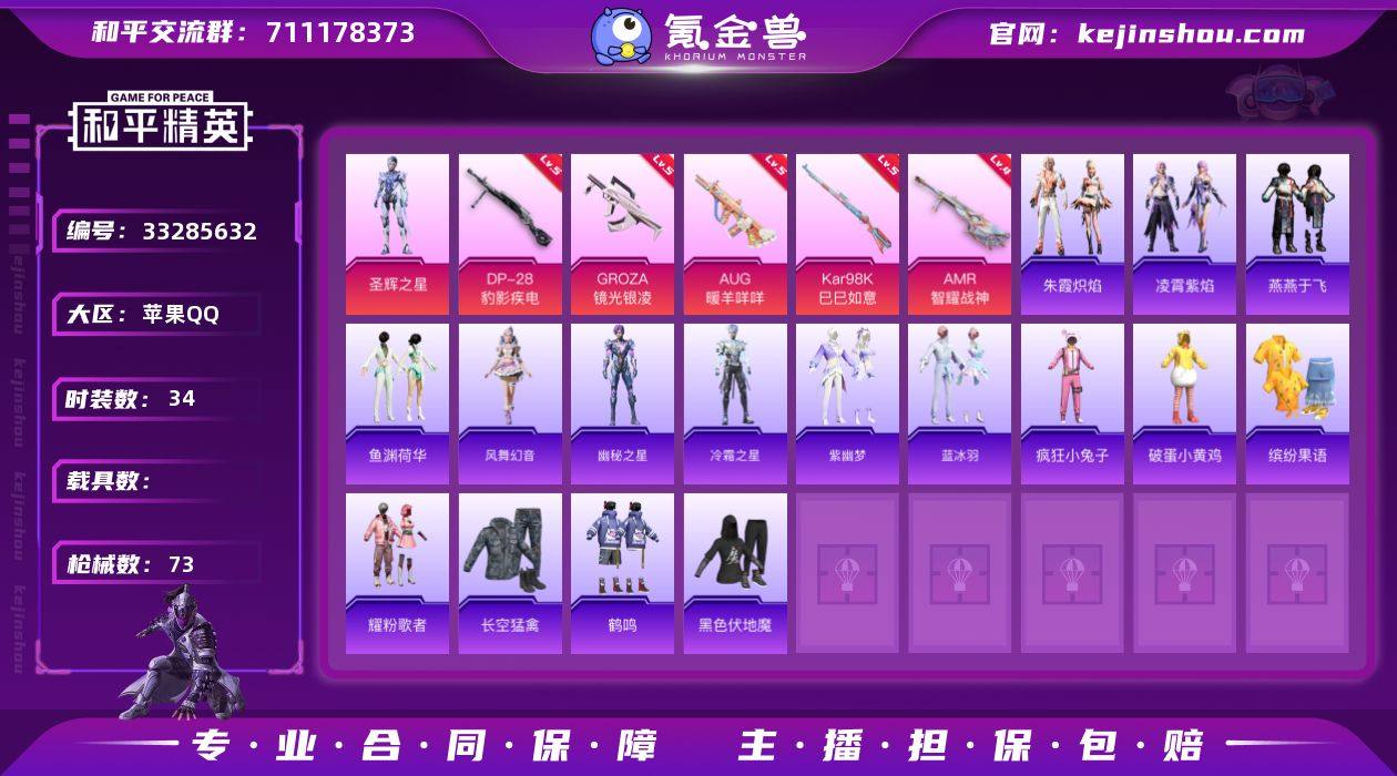 TD2641001有二次苹果 手Q-1粉装-5特效枪-0载具-1粉色飞行器-17204热力值-1王牌印记-34套装-73枪皮 【粉色套装】:角色-圣辉之星 【粉色枪皮等级】:GROZA-镜光银凌(五级),AUG-暖羊咩咩(五级),Kar98K-巳巳如意(五级),AMR-智耀战神(四级),DP-28-豹影疾电(五级) 【粉色枪皮】:GROZA-镜光银凌,AUG-暖羊咩咩,Kar98K-巳巳如意,AMR-智耀战神,DP-28-豹影疾电 【粉色飞行器】:圣辉之星飞行器 【粉色降落伞】:创世·救赎降落伞,幻影飞狐降落伞,圣辉之星降落伞,智耀战神降落伞 【稀有套装】:套装-迅捷龙虾,套装-遗迹猎人,套装-燕燕于飞,套装-鱼渊荷华,套装-风舞幻音,角色-幽秘之星,角色-冷霜之星,套装-紫幽梦,套装-蓝冰羽,套装-朱霞炽焰,套装-凌霄紫焰 【稀有枪皮】:AKM-破晓战魂,AKM-龙的传人,SCAR-L-夜灯,SCAR-L-红色方程式,M416-蓝色火焰,AUG-耀粉歌者,M762-天降萌叽,AC-VAL-天降萌叽,AC-VAL-圣辉之星,蜜獾-绯穹魔姬,ARX-凌霄紫焰,UZI-炫彩节奏,UZI-红色方程式,UMP45-夜灯,汤姆逊-天降萌叽,汤姆逊-像素花束,JS9-凌霄紫焰,M24-樱桃泡泡,SKS-炫彩节奏,Mini14-耀粉歌者,AMR-喜羊羊与灰太狼,S686-生命誓言,S12K-玩趣呆呆,S12K-夜灯,S12K...