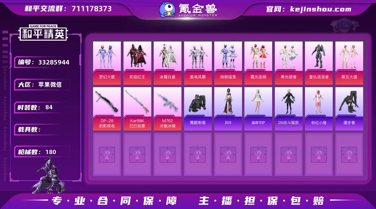 HJ6792 可二 65级 9粉装3特效枪131套装180枪皮11印记 【9粉装】 梦幻火箭 绚丽摇曳 第五大道 冰霜白皇 炙焰红王 霞光圣骑 紫电风暴 寒光使者 复仇流浪者 【3特效枪】 Kar98K-巳巳如意 (5级) DP-28-豹影疾电 (5级) M762-冷魅冰骑 (7级) 【8热门】 龟仙人 2B战斗服款 晶辉守护 鹰眼刺客 胖达团团 暗影哥特 粉红小猪 漫步者 【1飞行器】 太空嘟嘟飞行器 【1背包】 梦幻火箭背包