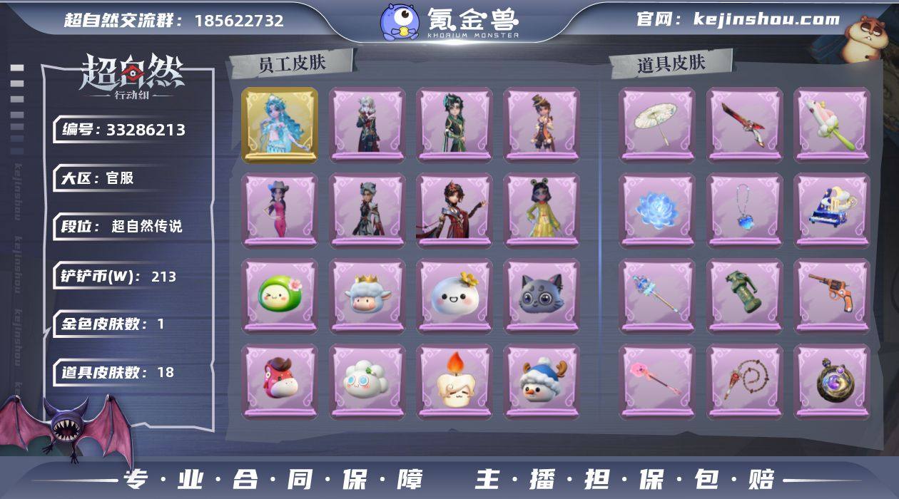 金皮1;紫皮7;道具皮18;皮肤:薇薇安-海月息潮,小黄-呱呱雨衣,阿念-庆宴绮愿,爱丽丝-耀眼的你,薇薇安-仙锋小姐,艾伦-黎明猎手,零-磨砺成锋,爱德华-梵卓之礼;道具:腰包-红运福虎,摸金符-海洋之心,伞-郁金春信,除颤仪-冰晶般的代价,专业手电-星寂,音响-月光奏鸣曲,转轮手枪-新星时代,铲子-赞萌波板糖,刺刀-美鲨匕首,喷气背包-乘风溯雪,长鞭-缚誓之锁,闪光弹-金戈玄铜,短管猎枪-安魂曲,电击枪-权杖的许诺,荧光棒-花火-荧光棒-花火,音响-鸣沙鼓,传送按钮-逆时审判,急救包-蔷薇物语;美妆:美妆-听潮祝福;饰品:头饰-蒜了八,头饰-烈焰红唇头套,头饰-鱼头怪头套,头饰-萨卡班甲鱼头套,头饰-卑微头套,头饰-太空鲨头套,头饰-面具马头套,头饰-烛光纪念,头饰-哈士奇头套,头饰-青团糯糯,头饰-饺饺者头套,头饰-火爆了头套,头饰-惊魂南瓜头套,头饰-嘻嘻头套,头饰-雪墩墩头套,头饰-樱桃奶油布丁,头饰-滑稽头套,头饰-大葱明头套,头饰-芝麻糊汤圆,头饰-马上有钱,头饰-煤球喵头套,头饰-小羊的王子梦,头饰-呆滞头套,头饰-像素朋克墨镜,头饰-后室幸存者头套,挂饰-糖果守卫,挂饰-桂冠聆诗,挂饰-春信香囊,挂饰-钗头凤,挂饰-孤独对望,挂饰-不朽的今夜,挂饰-晚安小熊,背饰-牛啤背包,背饰-夜浮船,...