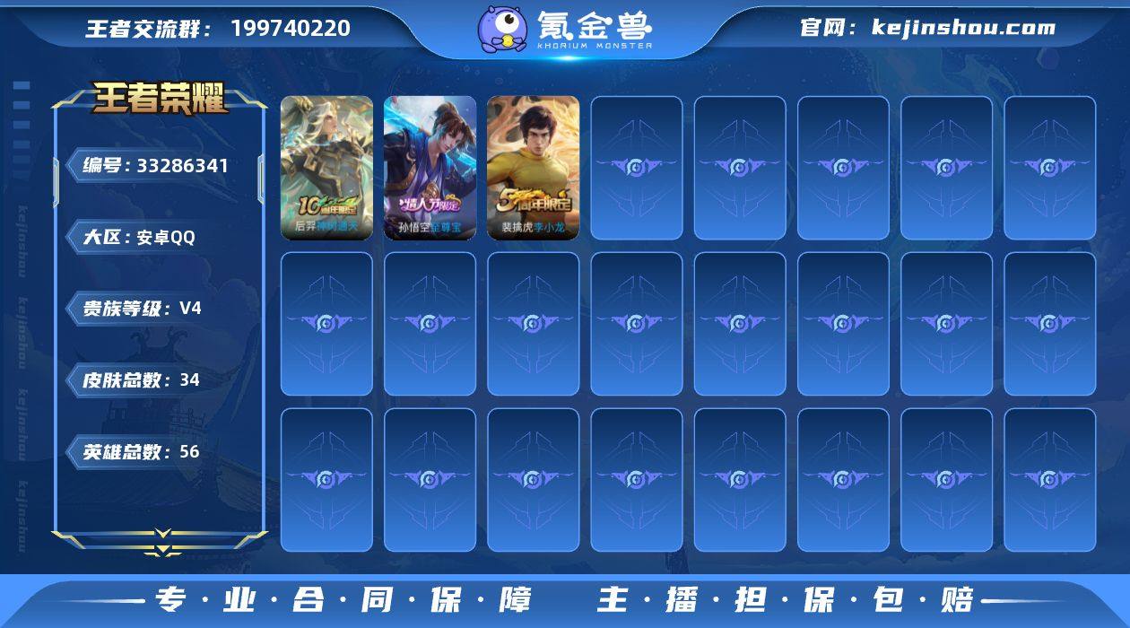 安卓Q 不可二次 1传说55英雄34皮肤 神树通天 至尊宝 黄忠百相守梦 李小龙 地狱岩魂 箭羽风息 鬼剑武藏 克喵 魅力维加斯 水果甜心 王者荣耀账号